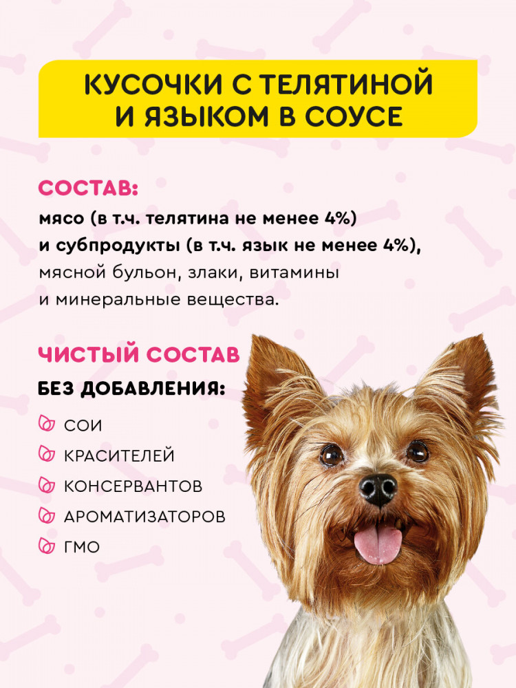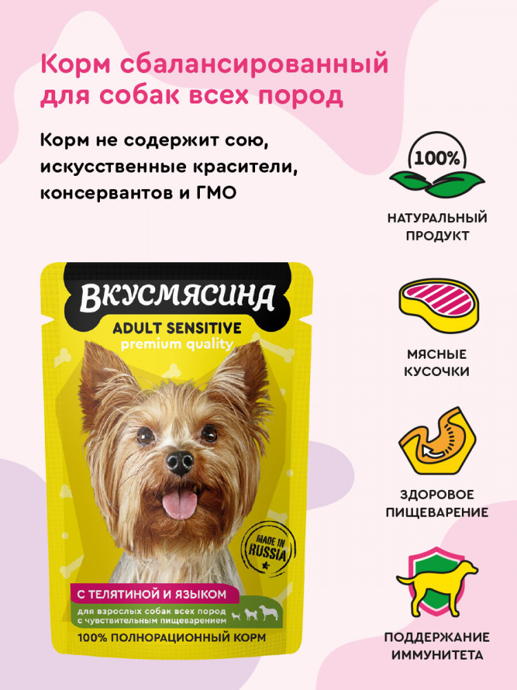 Вкусмясина Корм влажный для собак с чувствительным пищеварением «Кусочки с телятиной и языком в соусе»