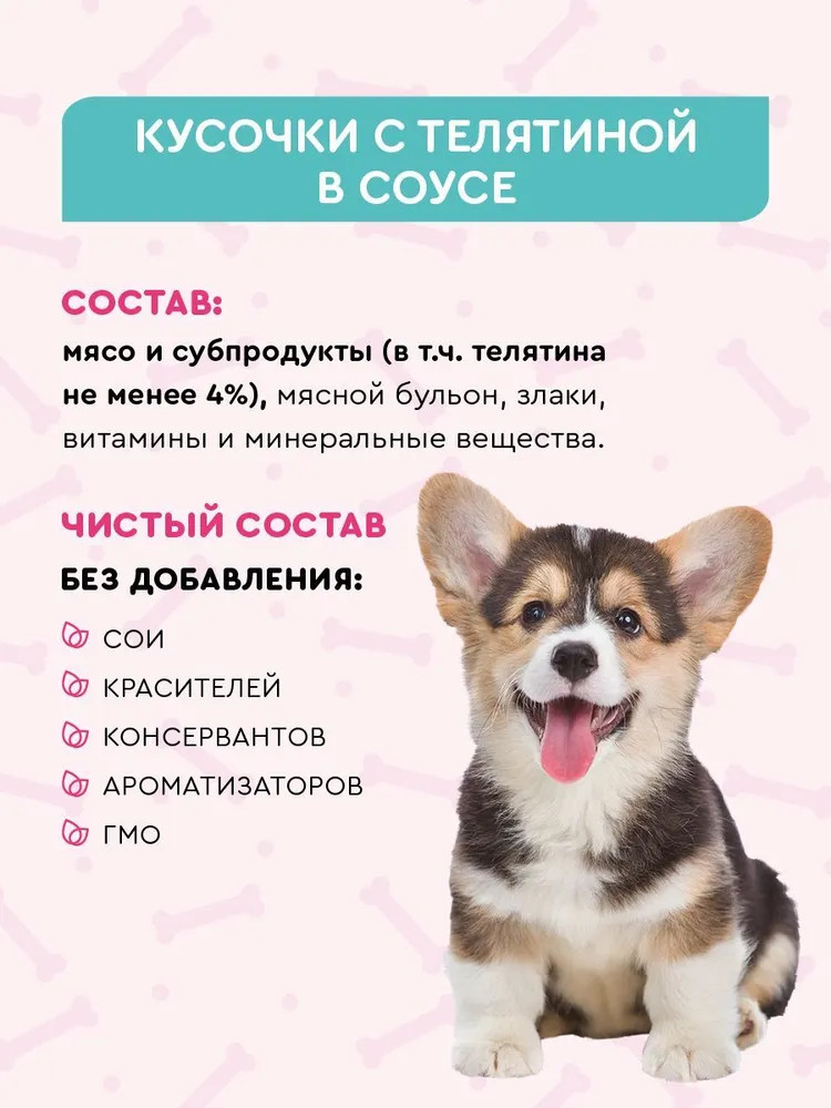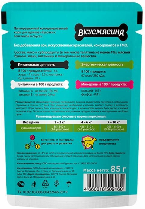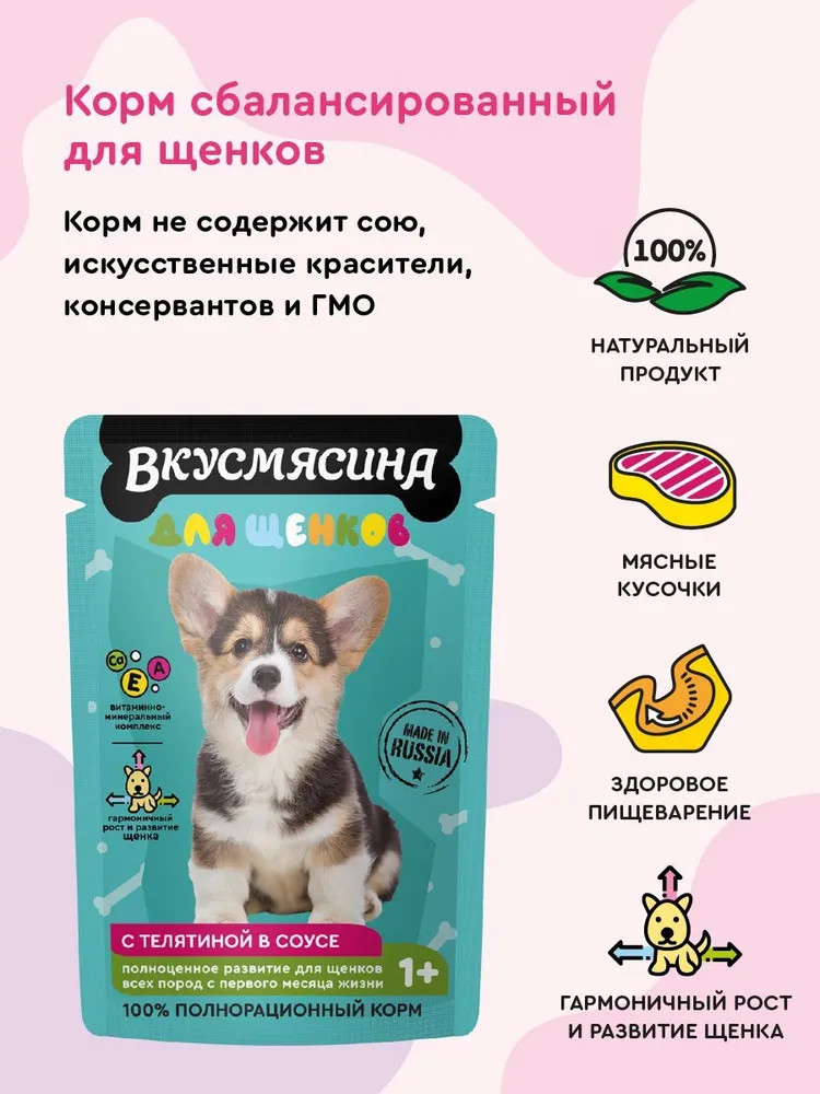 Вкусмясина Корм влажный для щенков «Кусочки с телятиной в соусе»