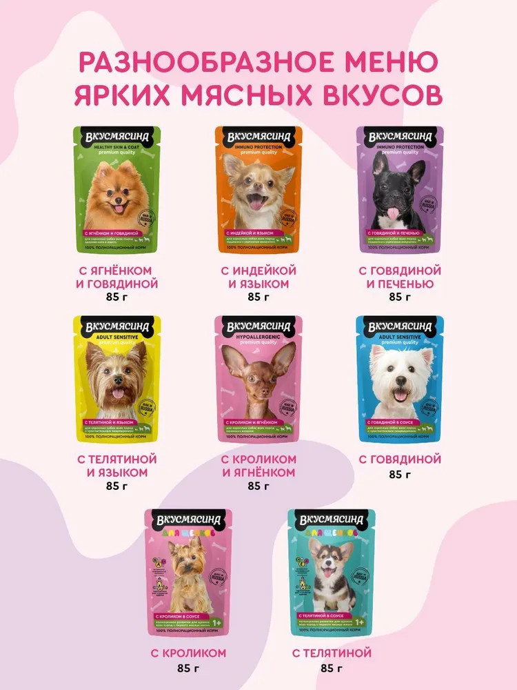 Корм для крупных пород собакКорм для средних пород собакВлажный корм Pedigree для собакВлажный корм для активных собакДиетический влажный корм для собакВлажный корм для собак PurinaВлажный корм Happy Dog для собакКорм влажный для здоровья зубов собакКорм влажный для собак с рыбойВлажный корм для собак с чувствительным пищеварениемКорм для мелких пород собакХолистик влажный корм для собакВлажный корм для собак с уткойКорм влажный для собак с кроликомКорм влажный для собак с ягненкомВлажный корм для взрослых собакВлажный корм для щенковВлажный корм для собак с курицейВлажный корм для собак с индейкойКорм влажный для собак с говядинойПремиум влажный корм для собакКорм влажный для аллергиков собак