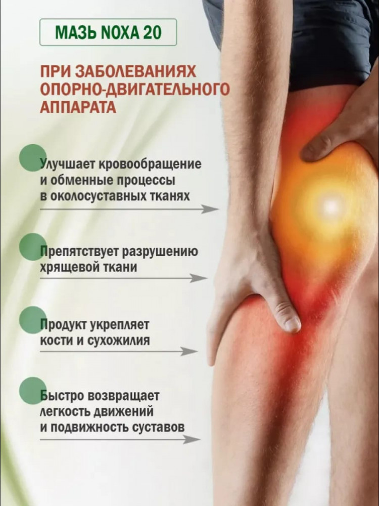 Мазь «Ноха» — средство для суставов, костей и мышц. «Ноха» — это эффективная мазь на основе натуральных компонентов, предназначенная для облегчения болей в суставах, мышцах и костях. Продукт помогает при артрите, артрозе, остеохондрозе, а также при мышечных спазмах и усталости ног.
