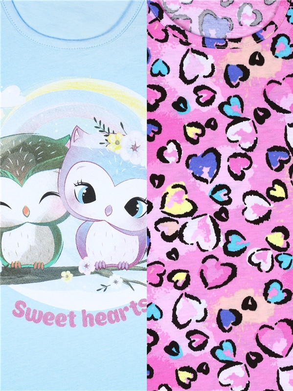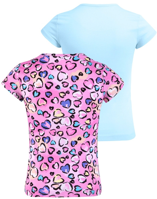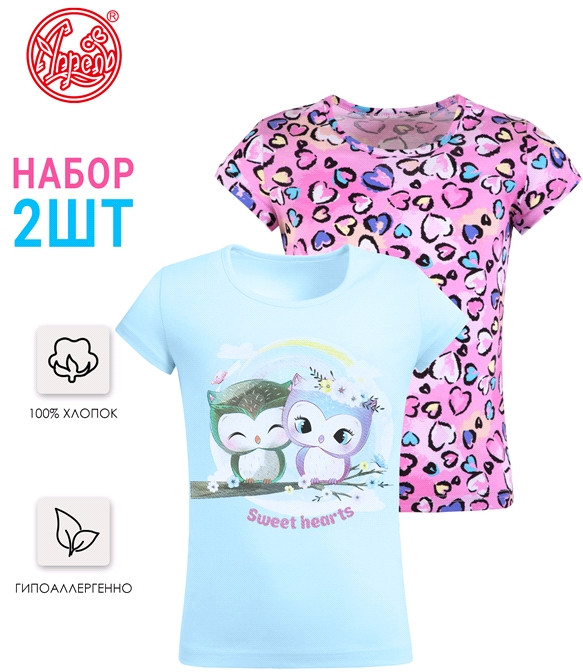 Комплект из двух футболок для девочки выполнен из кулира — легкого хлопкового полотна. Футболки облегающего силуэта с короткими рукавами, одна украшена нежным принтом, вторая дизайнерской набивкой.