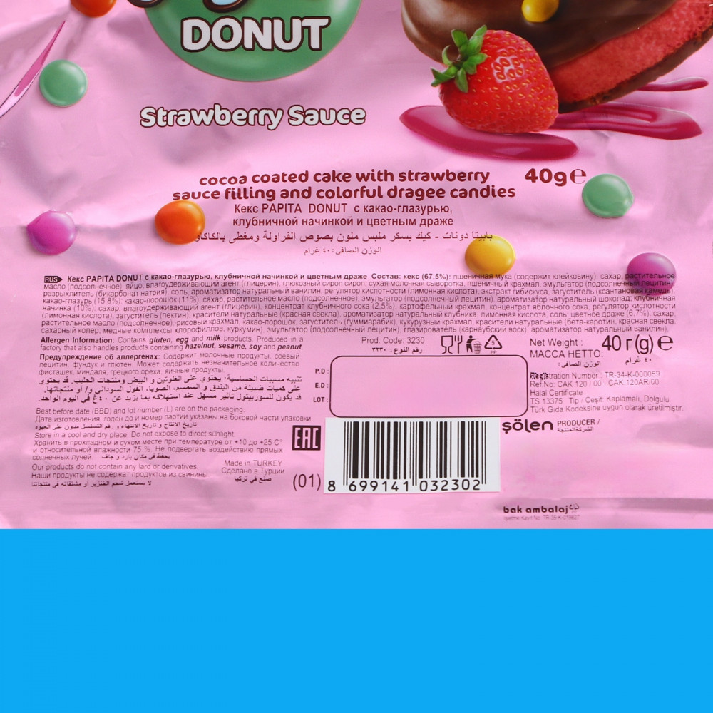 Solen Кекс с какао-глазурью, клубничной начинкой и цветным драже «Papita Donut»