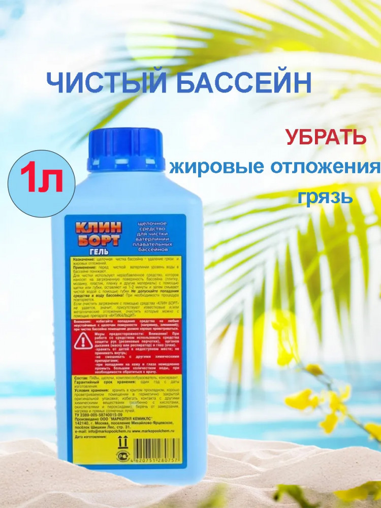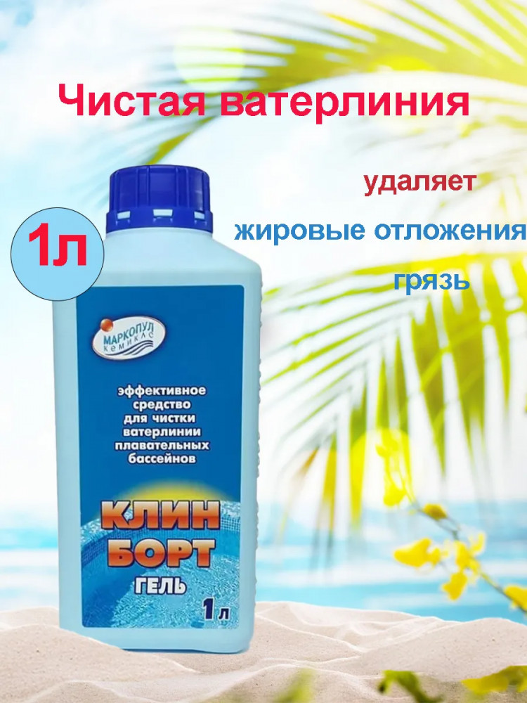 Гель «Клин Борт» — современная новинка в сфере чистящих средств, он предназначен для скорого очищения ватерлинию бассейна от слизи, грязевых и жирных накоплений. Производится и поставляется в флаконах с объёмом 1 л. В состав входят: щелочь, спирт и ПАВ, все эти компоненты помогают убрать нежелательные отложения, и предотвращает их возникновение.