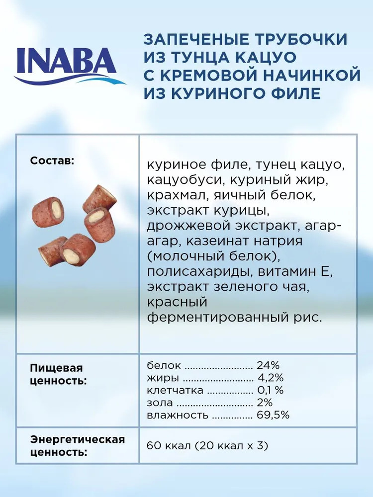 Inaba Набор трубочек запечных для кошек «Куриное филе и запеченный тунец Кацуо»В данный момент этот товар отсутствует в продаже. Возможно, у нас найдется аналогичный или похожий товар здесь. Серия: Churu Bee Супер-премиальное лакомство Churu Bee для кошек с нежной кремовой начинкой на основе филе фермерской курицы и кусочков мяса тунца Кацуо от японского производителя Inaba изготовлено исключительно из натуральных полезных ингредиентов. Запеченные трубочки имеют усиленный вкус вяленого тунца Кацуо, поэтому понравятся даже самым привередливым кошкам и котам. |