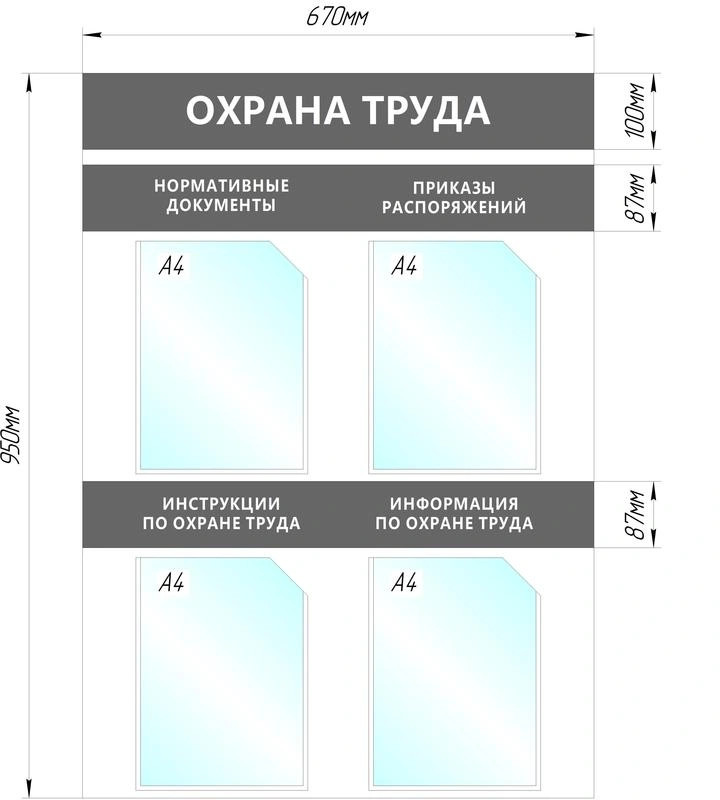 Attache Стенд информационный «Охрана труда»В данный момент этот товар отсутствует в продаже. Возможно, у нас найдется аналогичный или похожий товар здесь. Информационный стенд Охрана труда на 4 плоских кармана под лист формата А4 с дополнительными надписями. Основание стенда ПВХ 4 мм., заголовки — ПВХ плёнка серого цвета, плоские карманы под лист формата А4 изготовлены из ПЭТ 0.5 мм. Крепление стенда к стене по четырем углам, набор крепежа (4 самореза) в комплекте. |