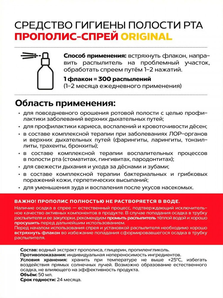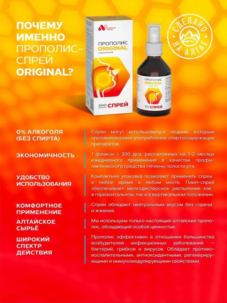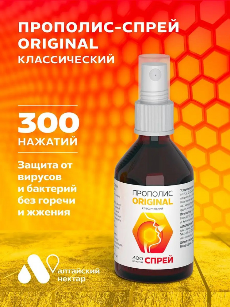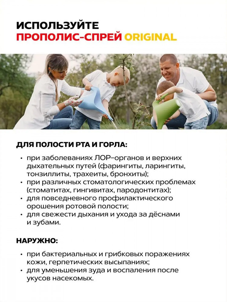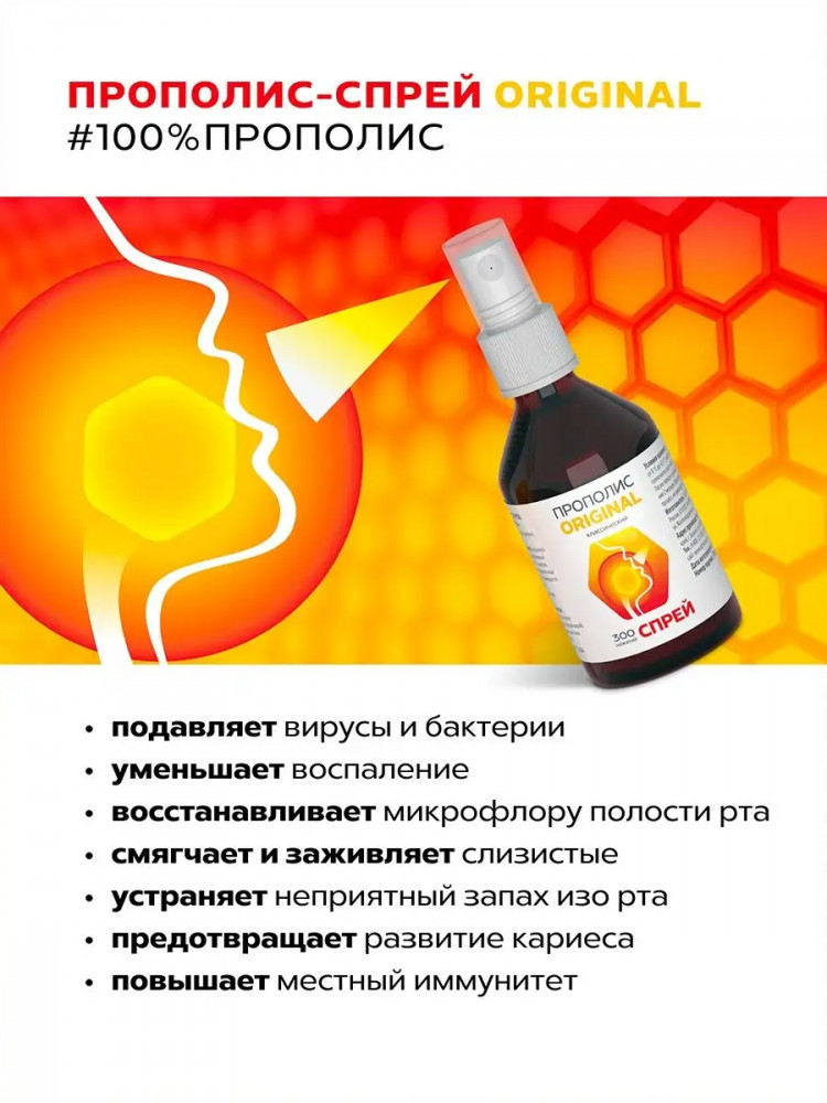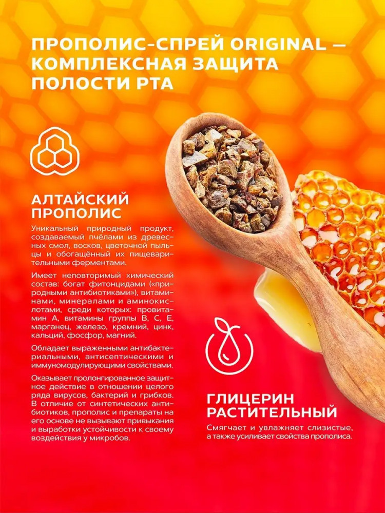Натуральный без спиртовой спрей для полости рта и горла на основе пчелиного прополиса. Обладает противовоспалительными и антисептическими свойствами (эффективен против большинства инфекционных возбудителей: грибков, бактерий и вирусов). Прополис-спрей «Original» — многофункциональное средство обладающее антибактериальным, противогрибковым, противовирусным, местным анестезирующим и противовоспалительным действием. Сохраняет здоровую микрофлору полости рта и горла, способствует поддержанию здоровья дёсен и зубов, предотвращая размножение патогенных бактерий, вызывающих кариес, освежает дыхание.