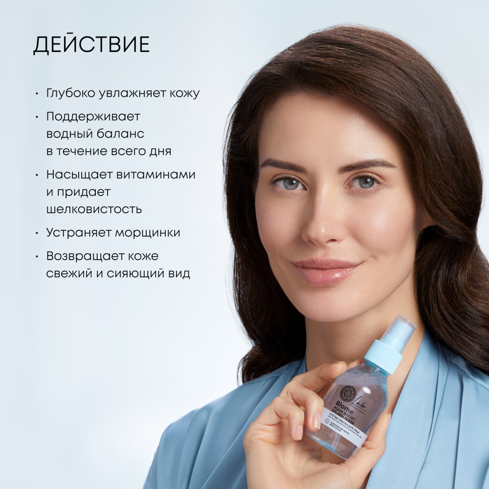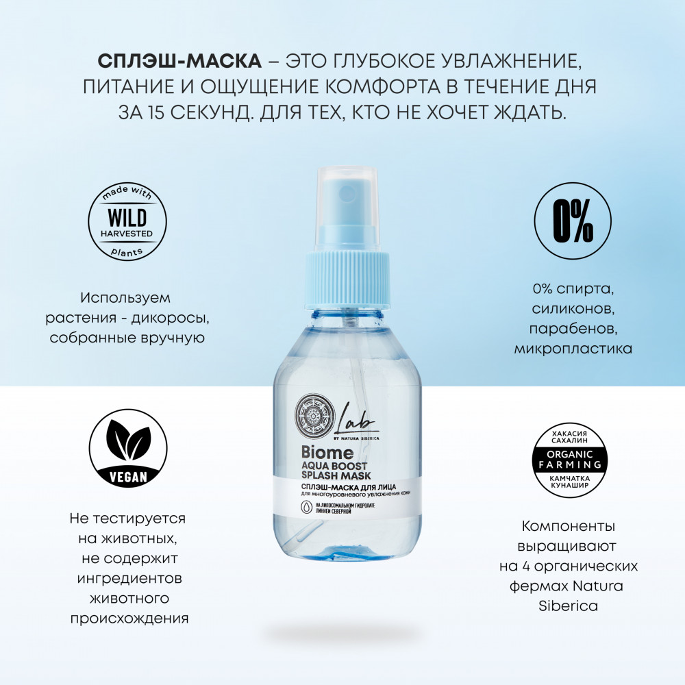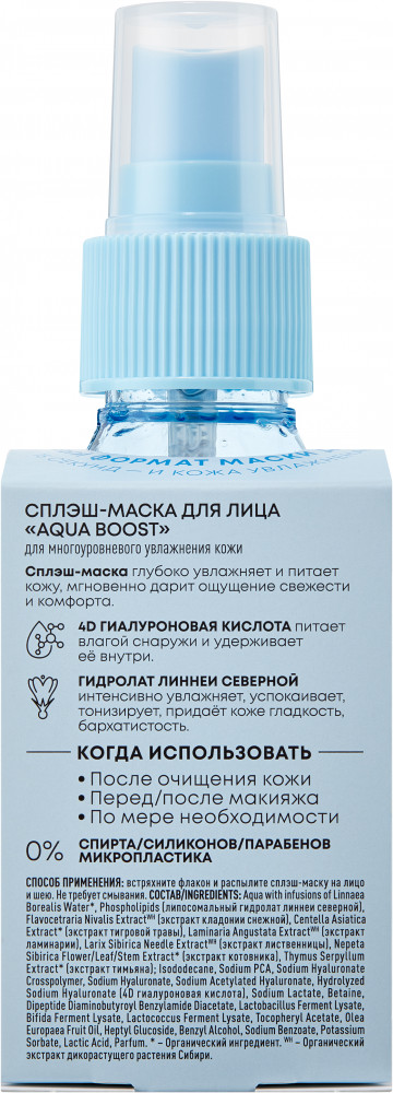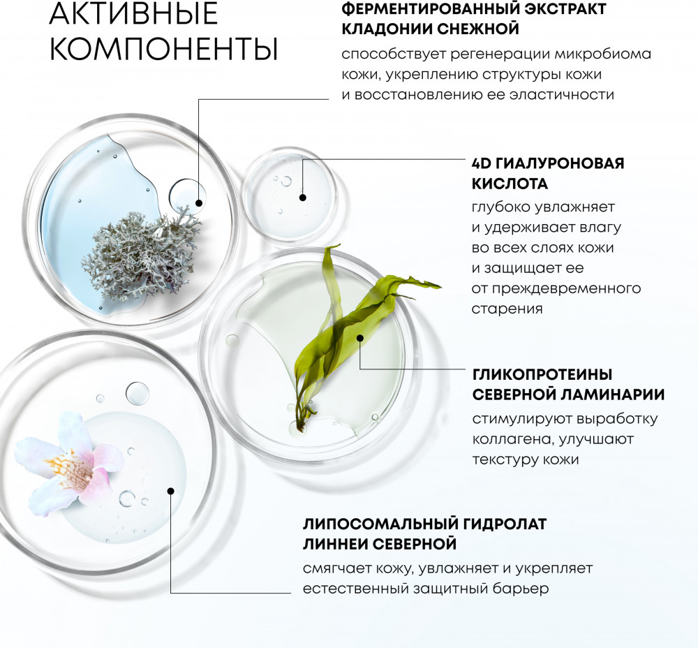 Aqua with infusions of Linnaea Borealis Water*, Phospholipids, (липосомальный гидролат линнеи северной), Flavocetraria Nivalis ExtractWH (экстракт кладонии снежной), Centella Asiatica Extract* (экстракт тигровой травы), Laminaria Angustata ExtractWH (экстракт ламинарии), Larix Sibirica Needle ExtractWH (экстракт лиственницы), Nepeta Sibirica Flower/Leaf/Stem Extract* (экстракт котовника), Thymus Serpyllum Extract* (экстракт тимьяна); Isododecane, Sodium PCA, Sodium Hyaluronate Crosspolymer, Sodium Hyaluronate, Sodium Acetylated Hyaluronate, Hydrolyzed Sodium Hyaluronate (4D гиалуроновая кислота), Sodium Lactate, Betaine, Dipeptide Diaminobutyroyl Benzylamide Diacetate, Lactobacillus Ferment Lysate, Bifida Ferment Lysate, Lactococcus Ferment Lysate, Tocopheryl Acetate, Olea Europaea Fruit Oil, Heptyl Glucoside, Benzyl Alcohol, Sodium Benzoate, Potassium Sorbate, Lactic Acid, Parfum. * – Органический ингредиент. WH – Органический экстракт дикорастущего растения Сибири