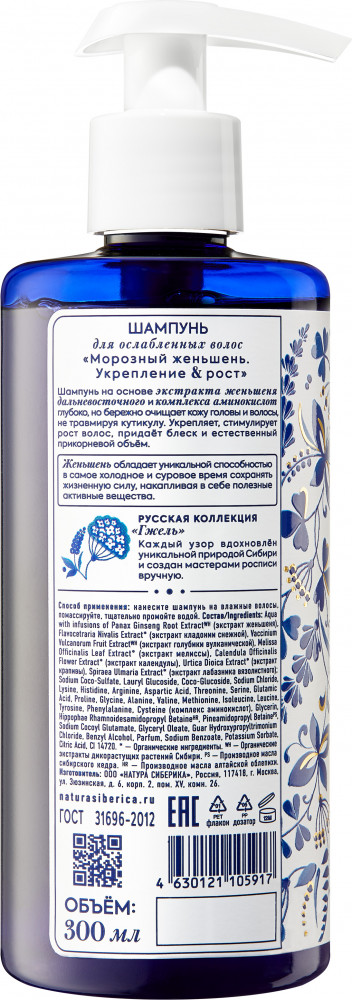Состав/Ingredients: Aqua with infusions of Panax Ginseng Root ExtractWH (экстракт женьшеня), Flavocetraria Nivalis Extract* (экстракт кладонии снежной), Vaccinium Vulcanorum Fruit ExtractWH (экстракт голубики вулканической), Melissa Officinalis Leaf Extract* (экстракт мелиссы), Calendula Officinalis Flower Extract* (экстракт календулы), Urtica Dioica Extract* (экстракт крапивы), Spiraea Ulmaria Extract* (экстракт лабазника вязолистного); Sodium Coco-Sulfate, Lauryl Glucoside, Coco-Glucoside, Sodium Chloride, Lysine, Histidine, Arginine, Aspartic Acid, Threonine, Serine, Glutamic Acid, Proline, Glycine, Alanine, Valine, Methionine, Isoleucine, Leucine, Tyrosine, Phenylalanine, Cysteine (комплекс аминокислот), Glycerin, Hippophae Rhamnoidesamidopropyl BetaineHR, Pineamidopropyl BetainePS, Sodium Cocoyl Glutamate, Glyceryl Oleate, Guar Hydroxypropyltrimonium Chloride, Benzyl Alcohol, Parfum, Sodium Benzoate, Potassium Sorbate, Citric Acid, CI 14720. * – Органические ингредиенты. WH – Органические экстракты дикорастущих растений Сибири. PS – Производное масла сибирского кедра. HR – Производное масла алтайской облепихи.