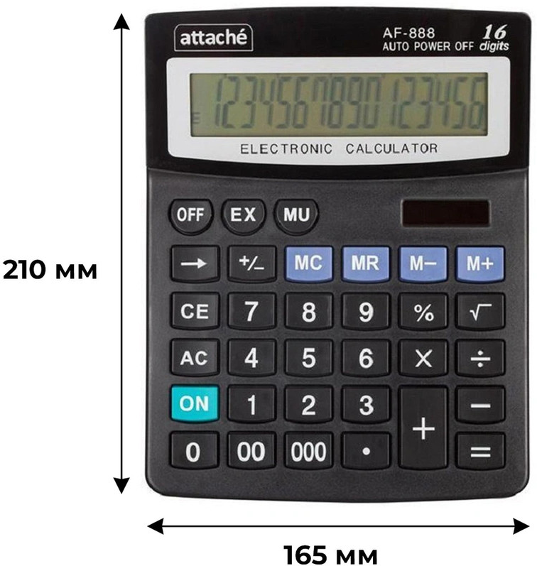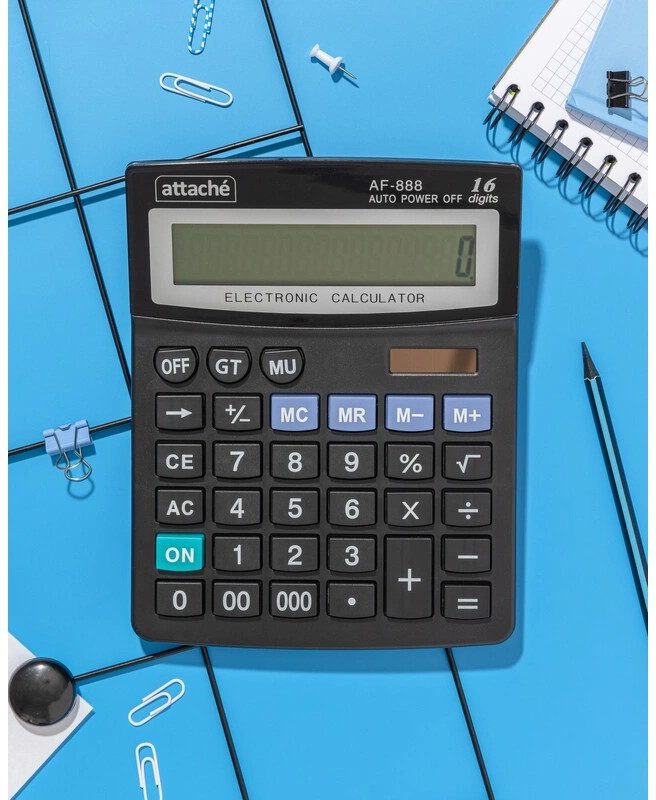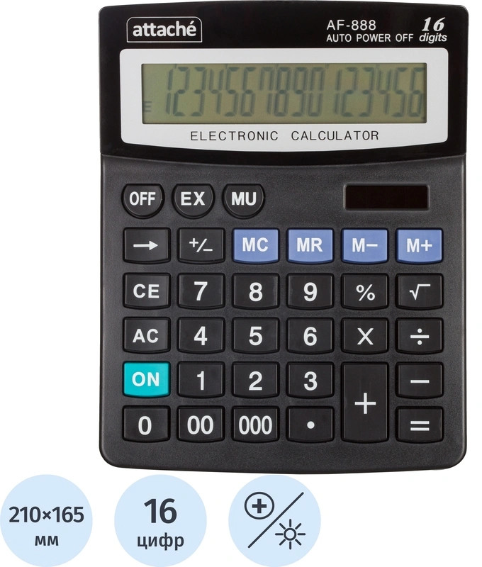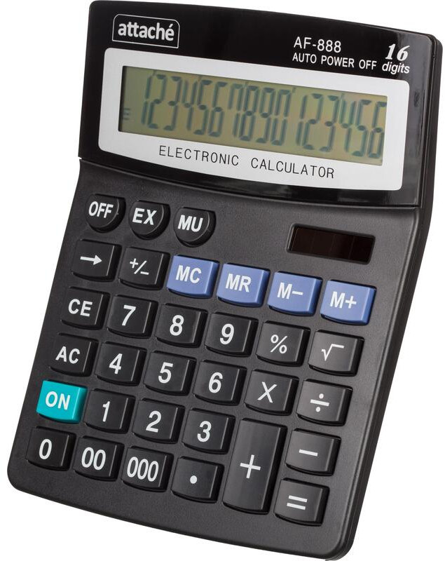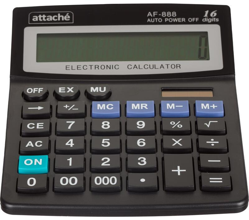 💳 Оплатить за товар можно при получении 🇰🇿 Есть бесплатная доставка по Казахстану от 1 дня 🎁 Копите бонусы с каждой покупки Калькулятор Attache AF-888 настольный в пластиковом корпусе с 16-разрядным ЖК-дисплеем. Имеет оптимальный набор вычислительных функций: основные математические операции, расчет процентов, извлечение квадратного корня, запоминание промежуточных результатов. Позволяет корректировать введенное число. Удобная клавиатура снабжена кнопкой ввода двойного и тройного нуля. В калькуляторе имеется два источника питания: солнечная батарея и батарейка AA. Обращаем внимание, что батарейка не входит в комплектацию данного калькулятора. |