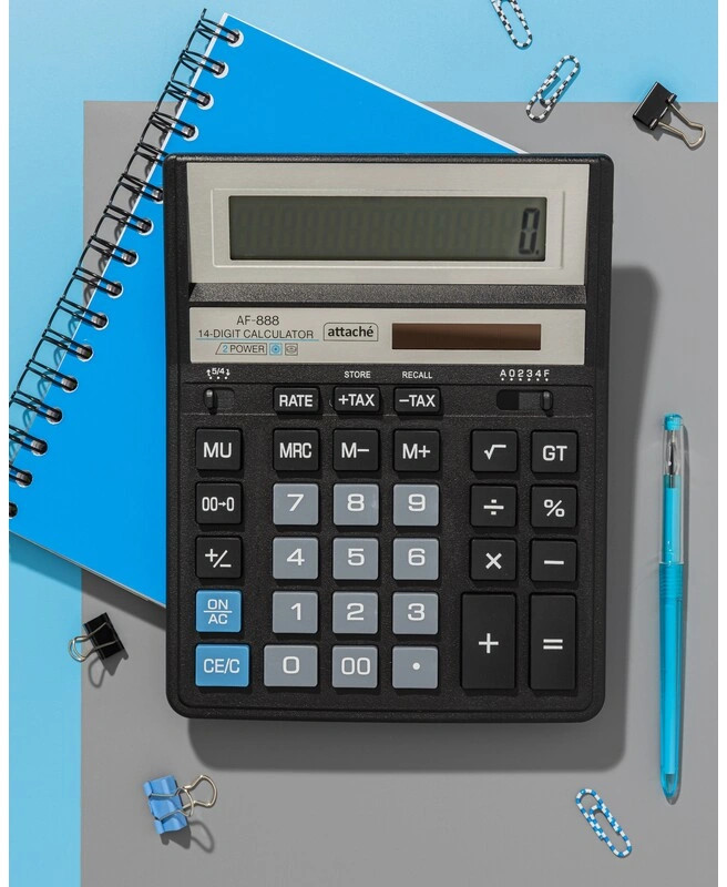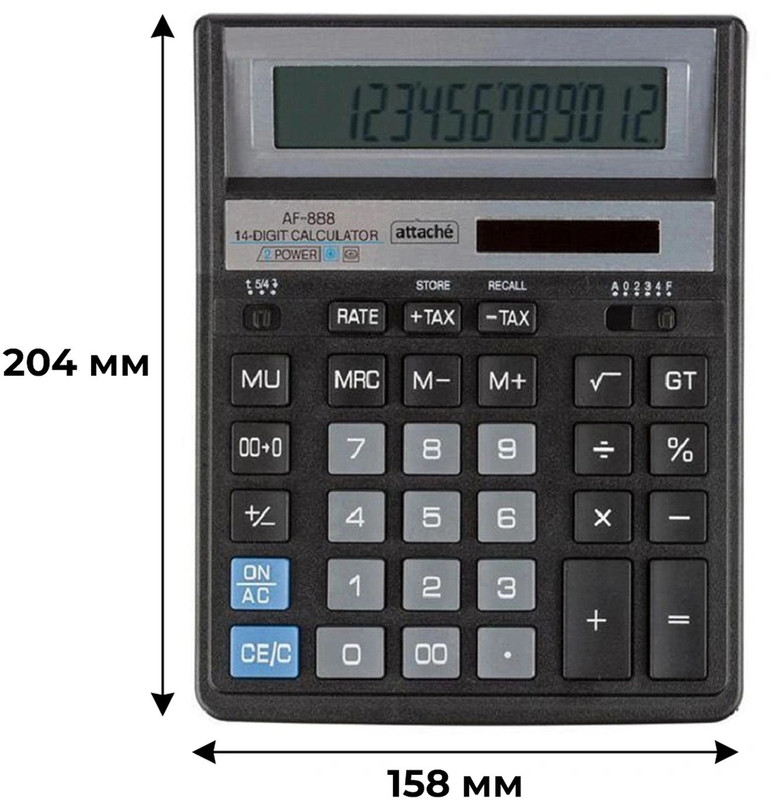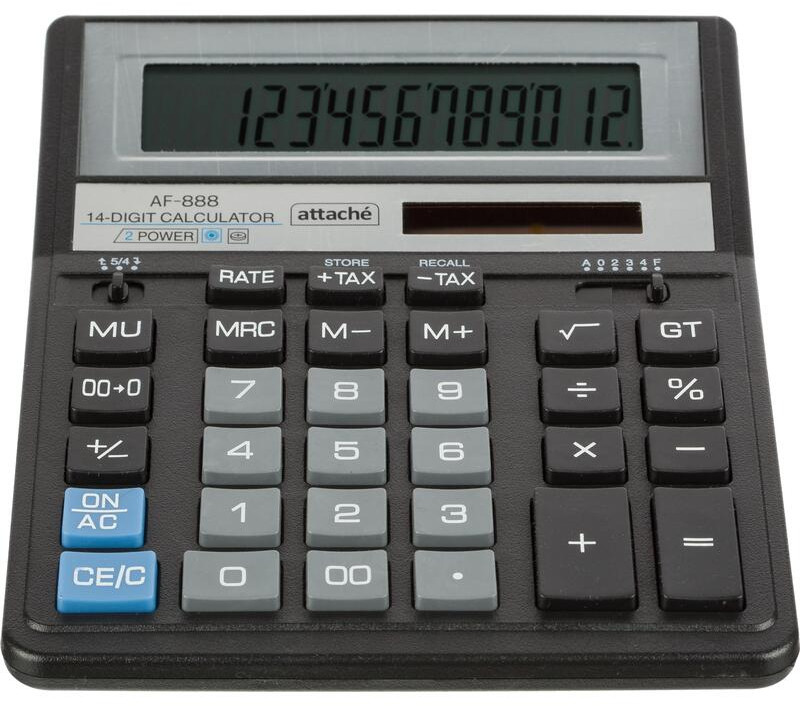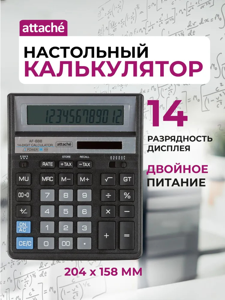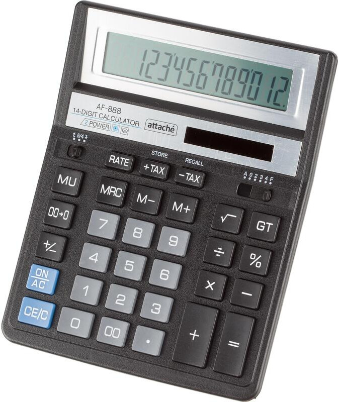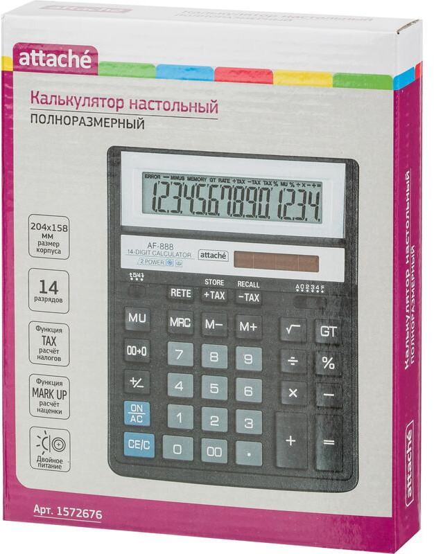 💳 Оплатить за товар можно при получении 🇰🇿 Есть бесплатная доставка по Казахстану от 1 дня 🎁 Копите бонусы с каждой покупки Калькулятор Attache AF-888 настольный в пластиковом корпусе черного цвета с 14-разрядным ЖК-дисплеем. Имеет оптимальный набор вычислительных функций: основные математические операции, расчет процентов, расчет наценки, извлечение квадратного корня, запоминание промежуточных результатов. Калькулятор имеет функцию автоматического отключения питания. Удобная клавиатура снабжена кнопкой ввода двойного нуля. В калькуляторе имеется два источника питания: солнечная батарея и батарейка G10 (не подлежит замене), а так же есть место для установки батареи AA (не входит в комплект). |