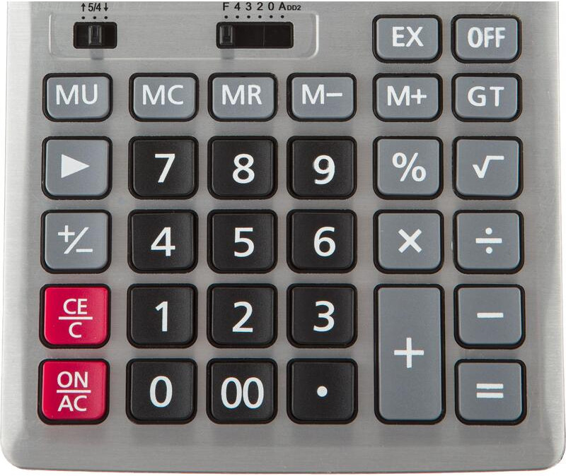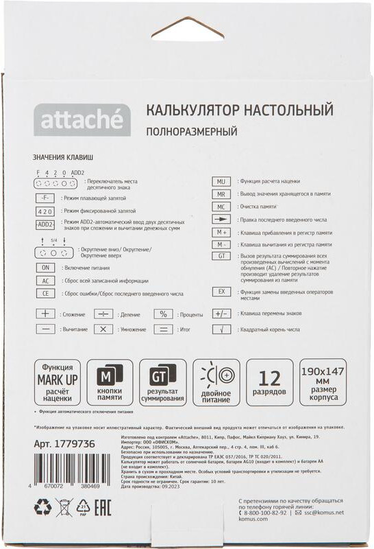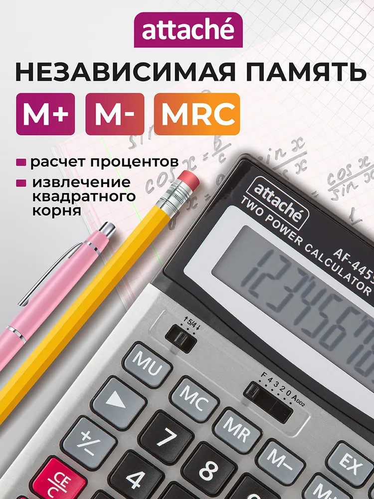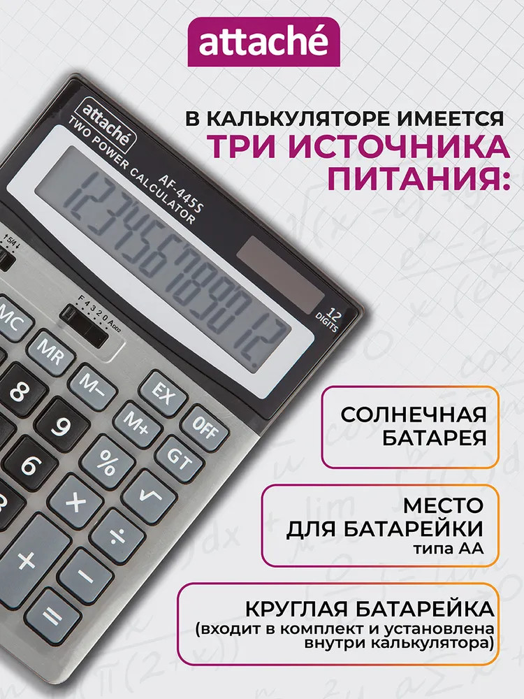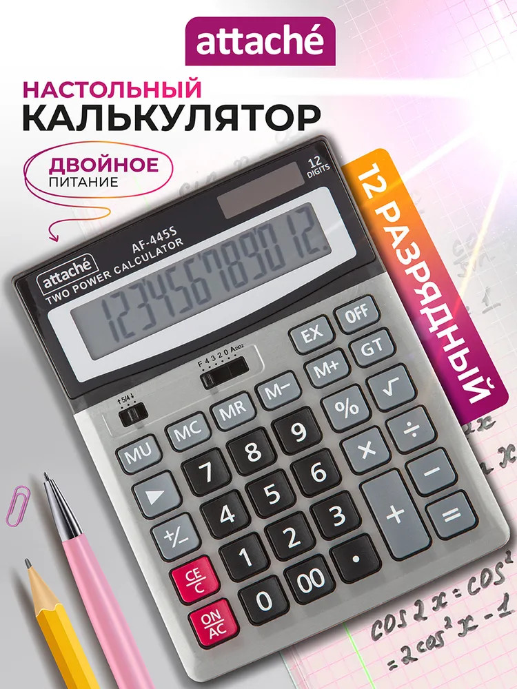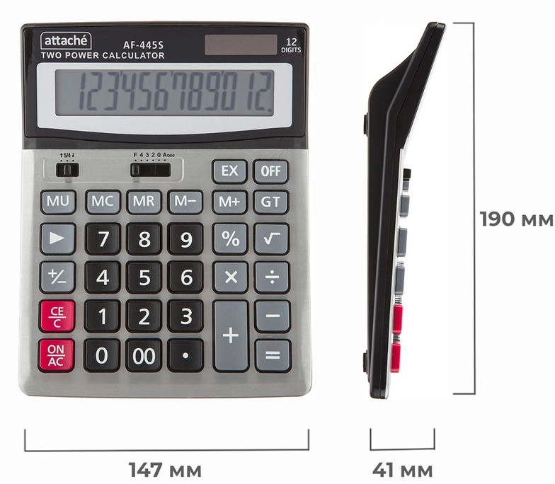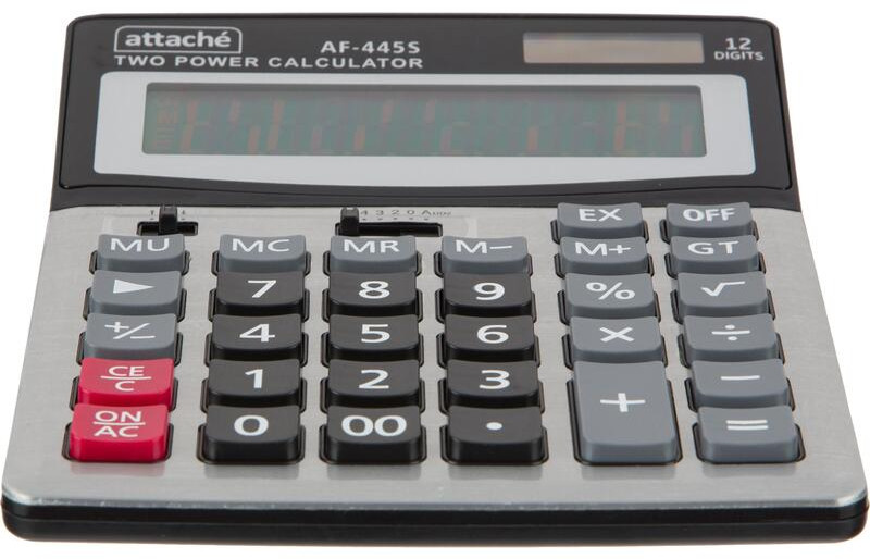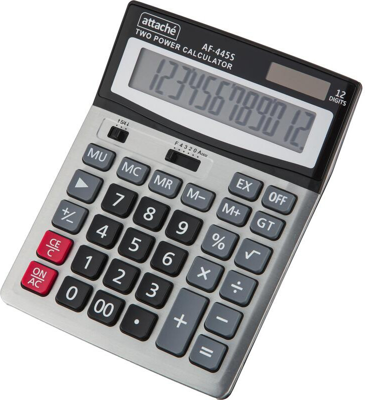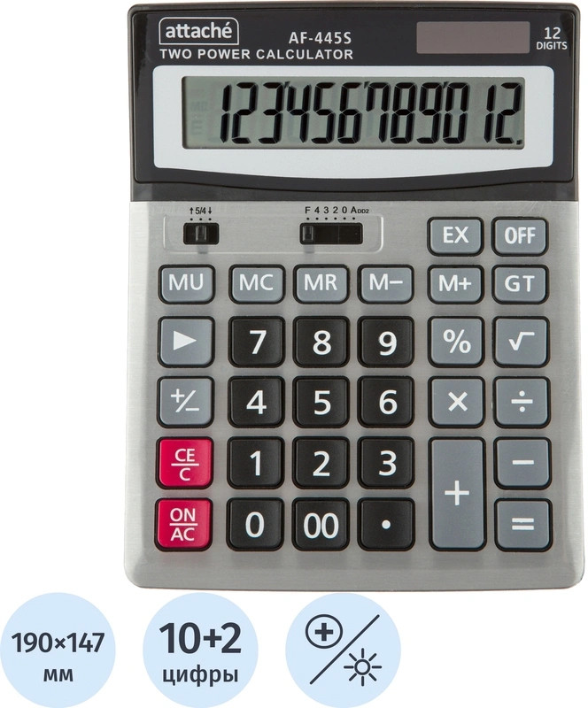💳 Оплатить за товар можно при получении 🇰🇿 Есть бесплатная доставка по Казахстану от 1 дня 🎁 Копите бонусы с каждой покупки Калькулятор Attache полноразмерный настольный AF-445S настольный с 12-разрядным дисплеем. Эргономичная форма металлической панели и крупные клавиши создают максимальный комфорт в использовании. Корпус изготовлен в сером цвете с кнопками и дисплеем черного цвета. Оптимальный и необходимый набор функций, среди которых: расчет процентов, вычисление квадратного корня, независимая память (М+, М-, МRC). Большой двенадцатиразрядный дисплей отображает большие значения с высокой точностью округления. В калькуляторе имеется три источника питания: круглая батарейка (входит в комплект и установлена внутри калькулятора), место для батарейки типа АА и солнечная батарея. |