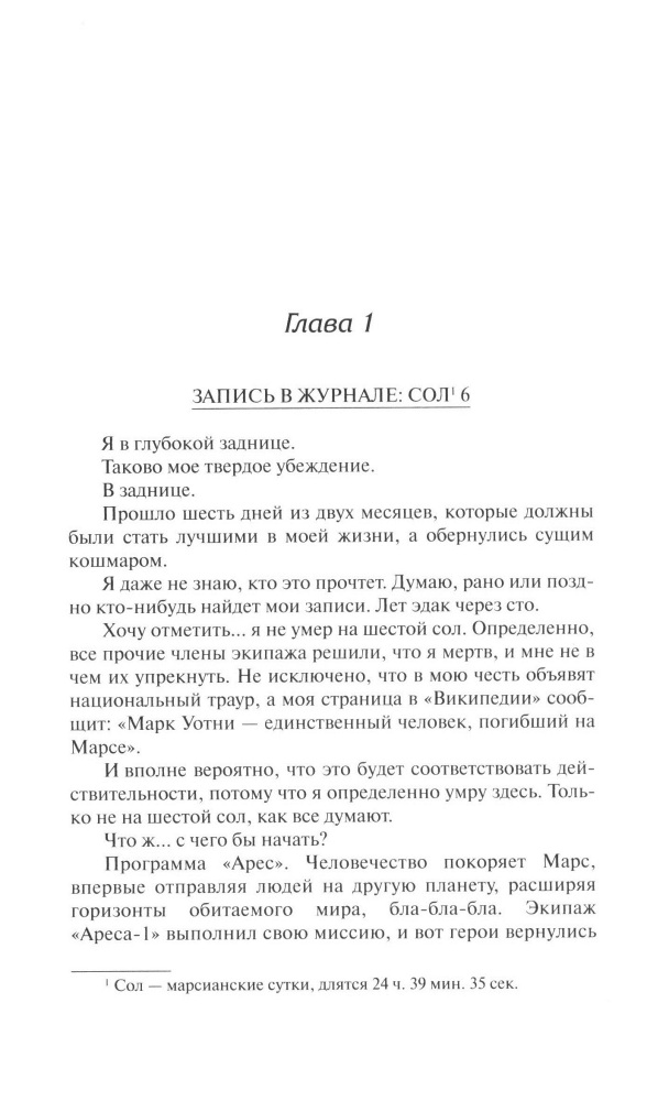 Прочитал на одном вдохе. Сюжет очень интересен. Полное одиночество. Надо быть полным оптимистом и иметь незыблемую надежду (но и подходящие знания будут плюсом), чтобы выжить на чужой планете. Текст читается легко, писался будто под сценарий, читаешь и в голове сцена из фильма проигрывается. К слову, в следующем году планируется выпуск одноименного фильма. Книга из категории MUST READ!