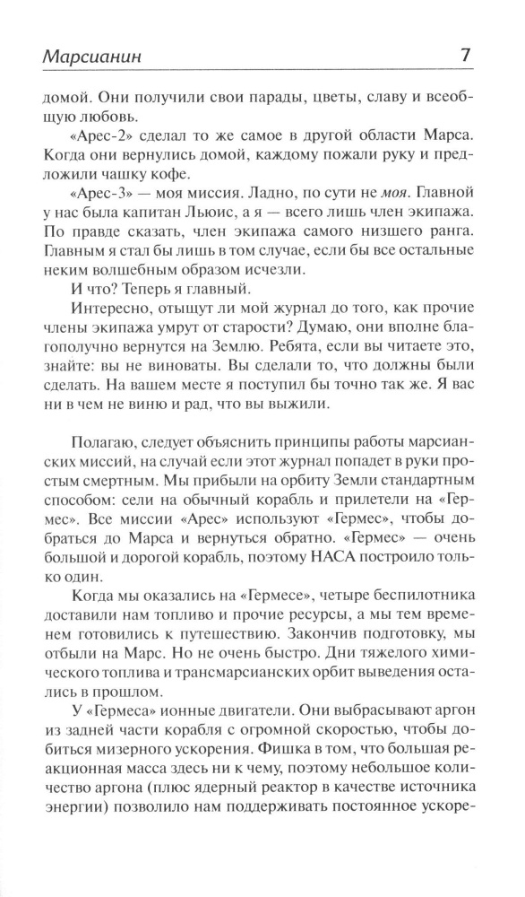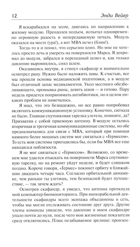 Отличная книга, когда читала не могла от нее оторваться :-) Книга очень интересно написана и реально переживаешь за главного героя - каждую минуту ожидая что что-то пойдет не так) В некоторых частях книги смеялась, в некоторых (как чувствительная особо) плакала)) В общем, если вы любите фантастику , да и если не любите - прочитайте обязательно! В ближайшее время, я думаю такие полеты уже будут возможны - поэтому воспринимается достаточно реально.