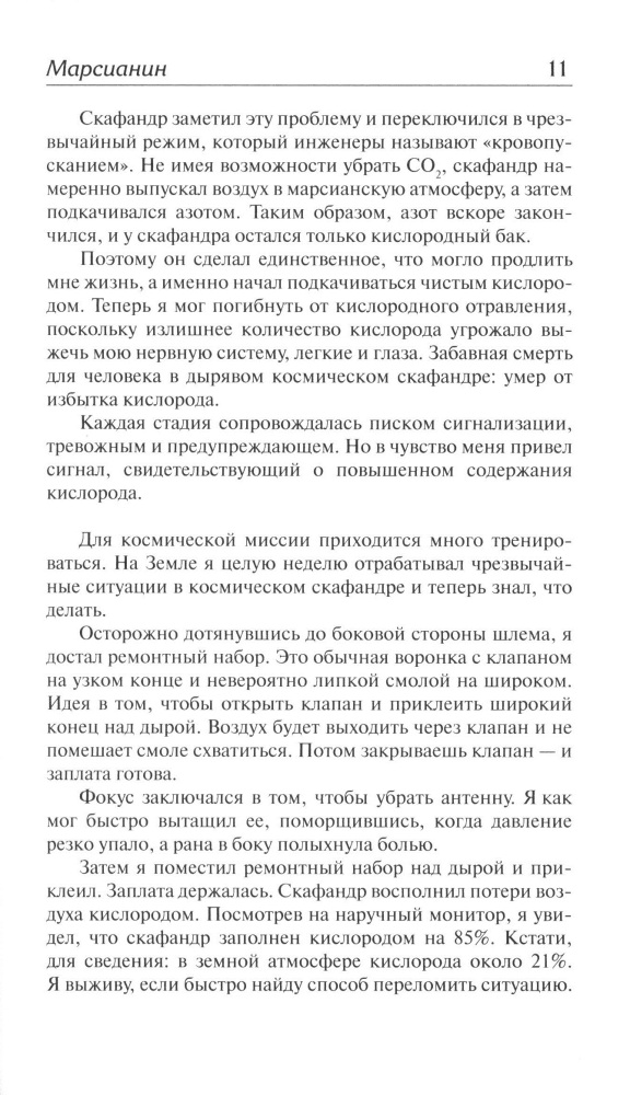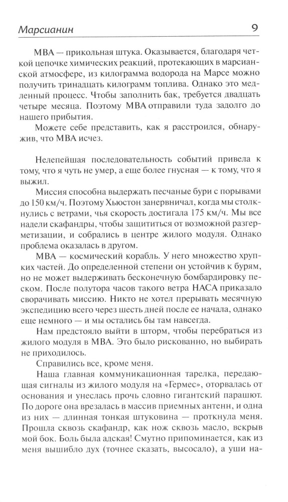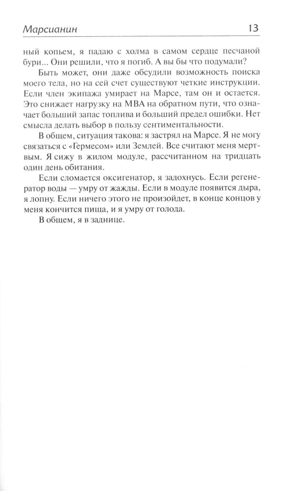 О внешности: хорошая обложка, плотные страницы, к флипу вопросов нет! А теперь о содержании книги: ересь полнейшая, такой чуши давно не читал. Американский тупой юмор, описание процессов которые вообще не вяжутся в уме! Я думал что он из пустых бутылок и изоленты построит ракету и улетит домой. Не тратьте деньги на эту книгу, скачайте и посмотрите одноименный фильм и забудьте. P/S. ОЧУМЕЛЫЕ РУЧКИ на Марсе, но не с Бахметьевым .