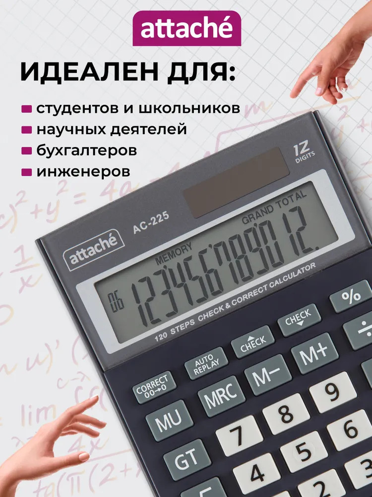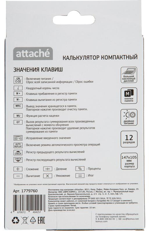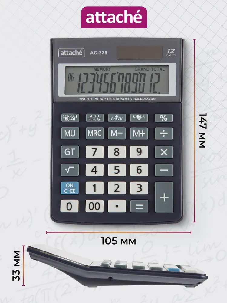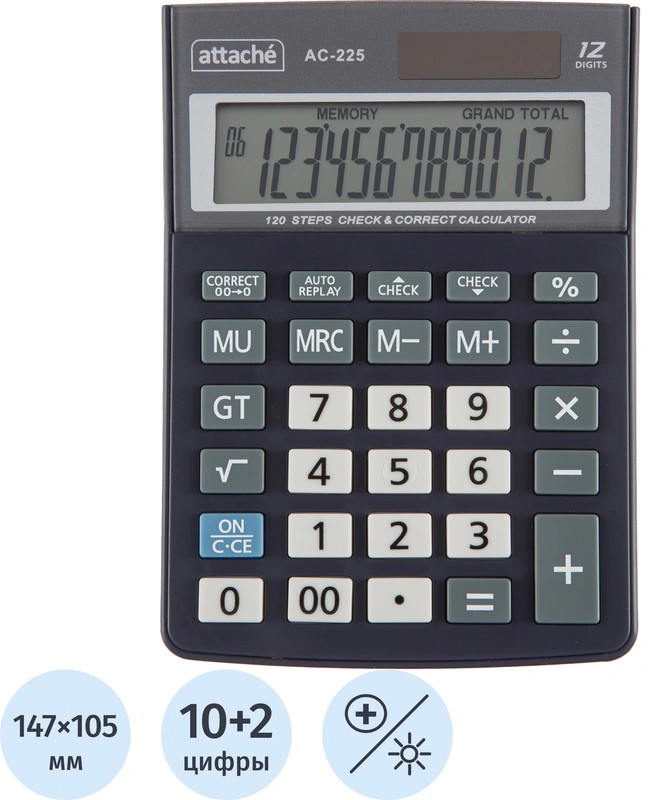 💳 Оплатить за товар можно при получении 🇰🇿 Есть бесплатная доставка по Казахстану от 1 дня 🎁 Копите бонусы с каждой покупки Калькулятор Attache настольный AС-225 компактного размера с 12-разрядным ЖК-дисплеем. Эргономичная форма панели и крупные клавиши создают максимальный комфорт в использовании. Корпус изготовлен в сером цвете с кнопками белого цвета. Оптимальный и необходимый набор функций, среди которых: MRC, M+, M-, GT, MU, расчет процентов, функция коррекции вычислений. Пересчет курса валюты: нет. Наклонный дисплей: фиксированный. В калькуляторе имеется два источника питания: батарейка типа LR44 (входит в комплект) и солнечная батарея. |