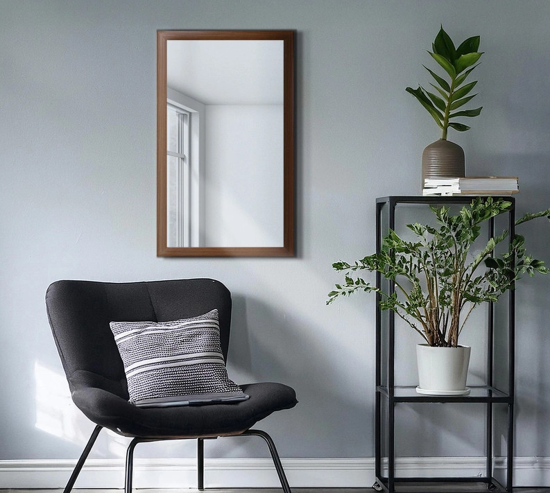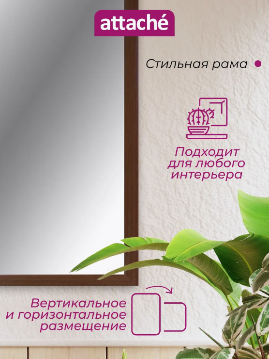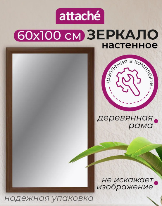 Настенное зеркало Attache, в багетной раме. Рама из деревоплиты (МДФ) с покрытием цвета орех. Возможно вертикальное или горизонтальное размещение . В комплект входит фурнитура для скрытого крепления. Размер багета (ШхГ): 50×18 мм.