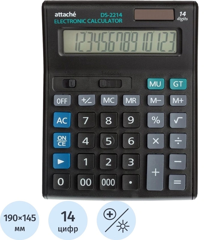 💳 Оплатить за товар можно при получении 🇰🇿 Есть бесплатная доставка по Казахстану от 1 дня 🎁 Копите бонусы с каждой покупки Калькулятор Attache настольный в пластиковом корпусе с 14-разрядным ЖК-дисплеем. Имеет оптимальный набор вычислительных функций: основные математические операции, расчет процентов, извлечение квадратного корня, запоминание промежуточных результатов. Позволяет корректировать введенное число, задавать настройки округления и количества знаков после запятой. Удобная клавиатура снабжена кнопкой ввода двойного и тройного нуля. Питание калькулятора автоматически отключается после пяти минут бездействия. В калькуляторе имеется два источника питания: солнечная батарея батарейка AA. Обращаем внимание, что батарейка не входит в комплектацию данного калькулятора. |