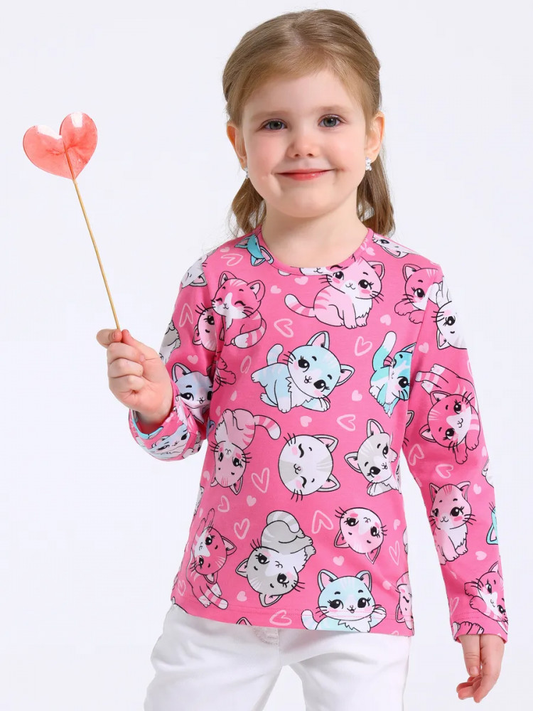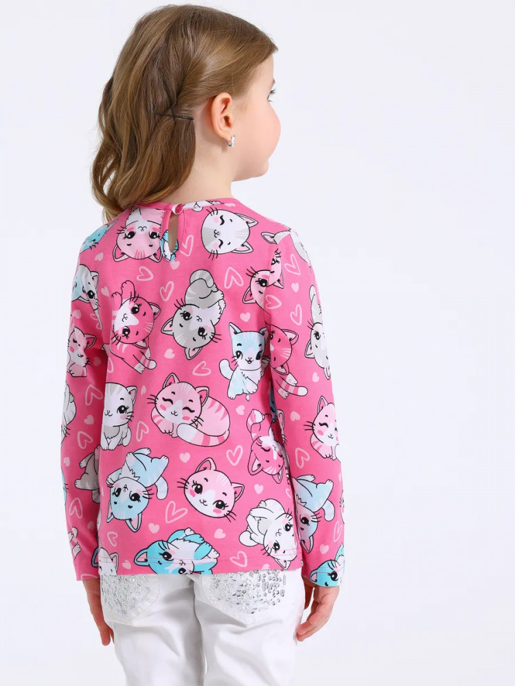 Лонгслив для девочки выполнен из кулира — тонкого хлопкового полотна. Изделие с длинными рукавами, по спинке застегивается на пуговку.
