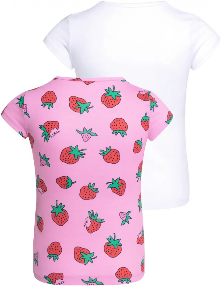 Комплект из двух футболок для девочки выполнен из кулира — легкого хлопкового полотна. Футболки облегающего силуэта с короткими рукавами, одна украшена нежным принтом, вторая дизайнерской набивкой.