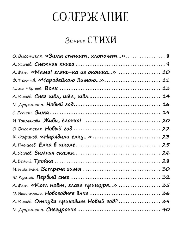 Довольна книгой - большая, бумага плотная, хорошего качества. Стихи складные, можно учить с детьми перед НГ. Из прозы - Морозко, По щучьему велению, Снегурочка. Из минусов - не так много картинок и стихов (листы цветные, но не заполнены прям картинками, тоже самое про стихи - по 1 стиху на страницу, а то и на разворот). В целом книга отличная, порекомендовала бы её к покупке перед НГ!