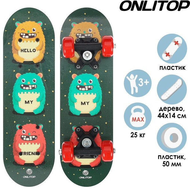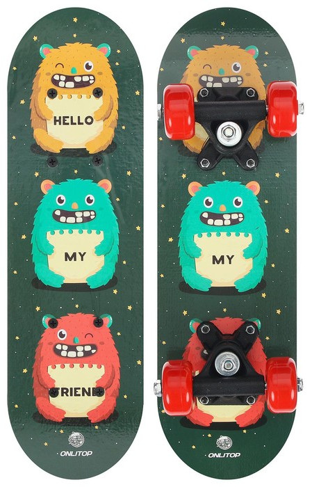 ONLITOP Скейтборд детский «Монстры»В данный момент этот товар отсутствует в продаже. Возможно, у нас найдется аналогичный или похожий товар здесь. Скейтборд подходит для начинающих райдеров от 3 лет. Предназначен для размеренного катания по городским дорожкам и в скейтпарках. Размер — 44×14 см. Количество колёс — 4 шт. Колёса — пластик, 50 мм. Максимальная нагрузка — 25 кг. Материал деки — дерево. Рама — пластик. |
