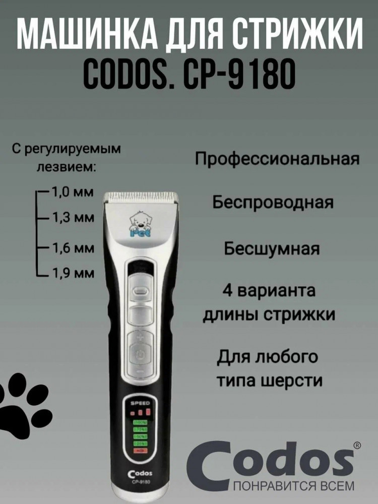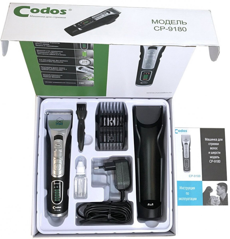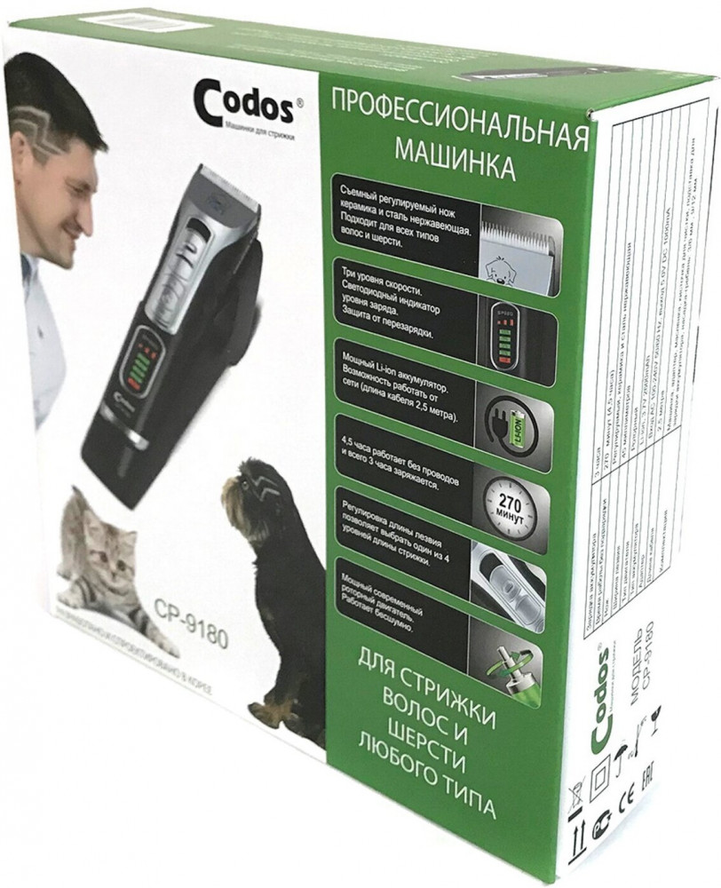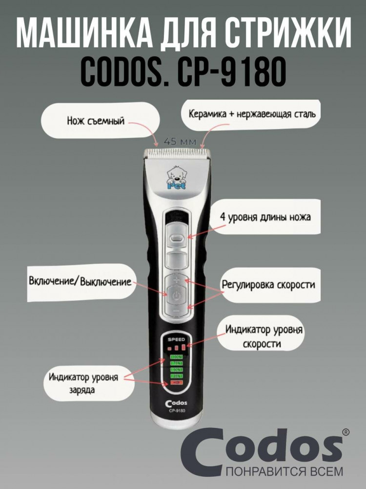 Торговая марка Codos — это профессиональное оборудование для груминга и парикмахерских: машинки для стрижки, фены-компрессоры, гриндеры. Машинки Codos работают от аккумулятора и от сети. Керамические лезвия легко справятся с волосами и любой шерстью животных, даже самой мягкой.