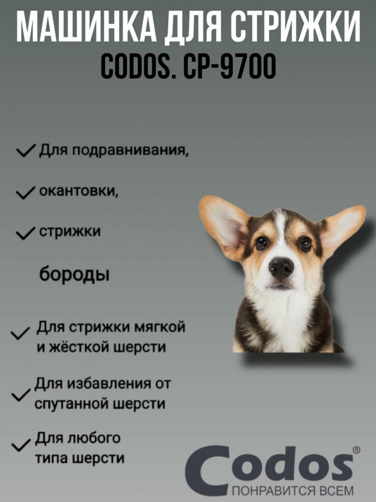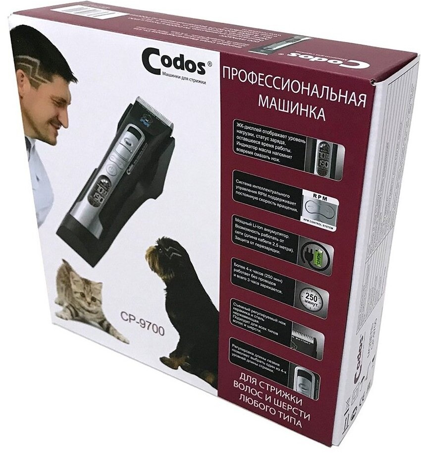 Торговая марка Codos — это профессиональное оборудование для груминга и парикмахерских: машинки для стрижки, фены-компрессоры, гриндеры. Машинки Codos работают от аккумулятора и от сети. Керамические лезвия легко справятся с волосами и любой шерстью животных, даже самой мягкой.