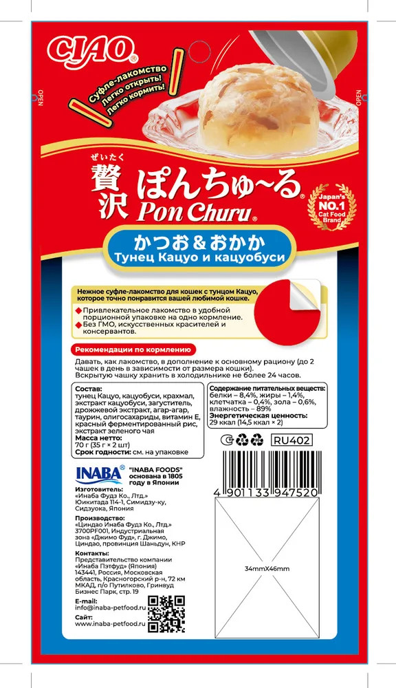 💳 Оплатить за товар можно при получении 🇰🇿 Есть бесплатная доставка по Казахстану от 1 дня 🎁 Копите бонусы с каждой покупки Серия: Ciao Pon Churu Привлекательное лакомство для кошек в виде нежного суфле суперпремиум класса (холистик) на основе филе глубоководного тунца и кацуобуси Ciao Pon Churu от японского производителя Inaba изготовлено исключительно из натуральных ингредиентов и отличается высоким процентом влажности, благодаря чему поддерживается водный баланс организма кошки. Корма и лакомства Inaba отличаются высоким качеством и неповторимым вкусом, ведь они изготавливаются только из отборных традиционных японских ингредиентов! Ciao Pon Churu создано для кошачьего счастья! |