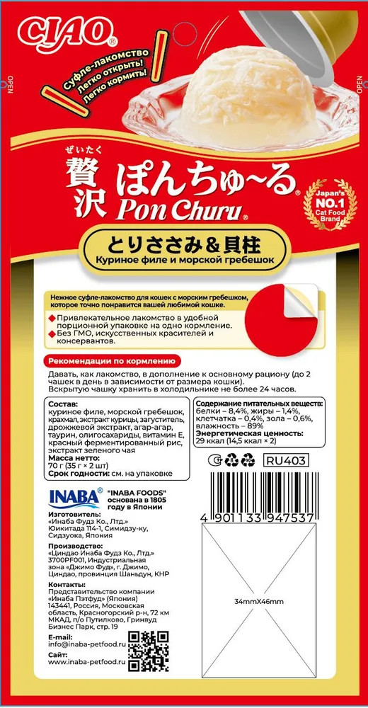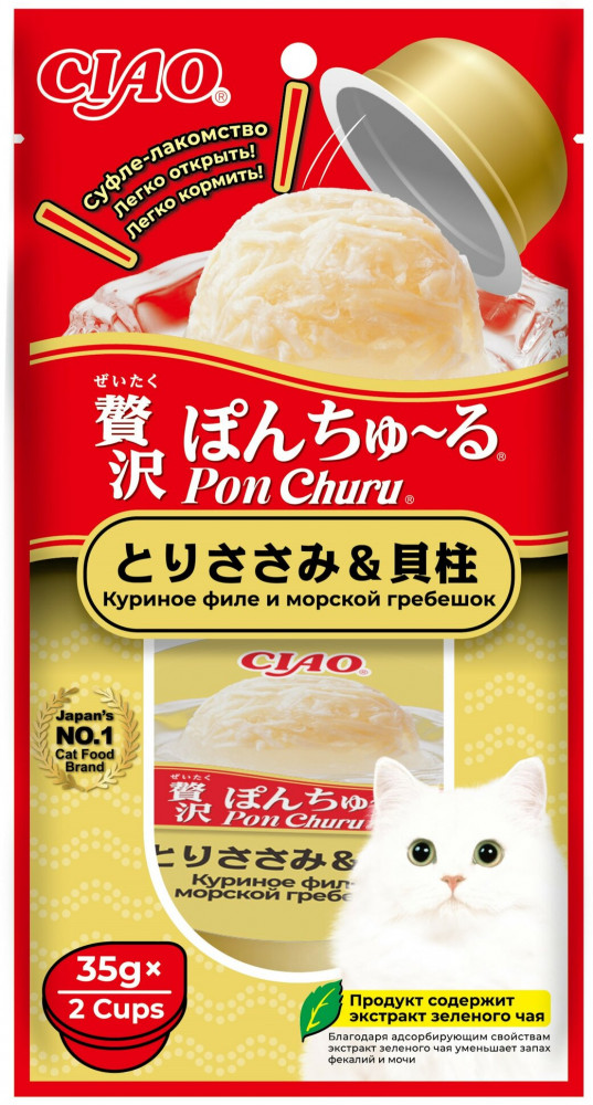 Inaba Лакомство для кошек «Суфле куриное филе и морской гребешок»-20% +70