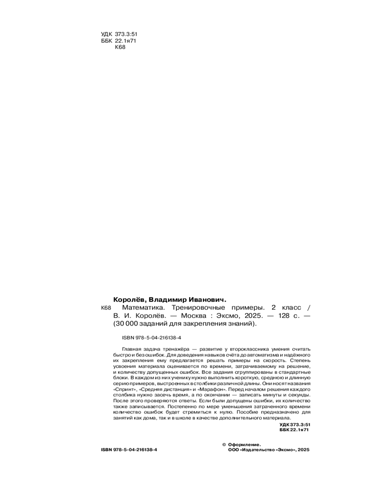 💳 Оплатить за товар можно при получении 🇰🇿 Есть бесплатная доставка по Казахстану от 1 дня 🎁 Копите бонусы с каждой покупки Серия: 30000 заданий для закрепления знаний Научиться мгновенно считать в уме, не делая при этом ошибок, может любой школьник. Для этого нужно систематически и в большом объёме выполнять задания на каждое математическое действие. В этом тренажёре ученику предлагается решить 30 000 примеров по всем темам программы по математике за курс 2 класса. Выполнив такое количество примеров, школьник надёжно закрепит полученные знания и доведёт навык устного счёта до полного автоматизма. Благодаря регулярной работе с тренажёром второклассник сможет оценить уровень своих знаний и заметно его повысить. |