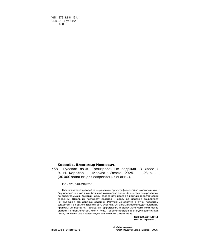 💳 Оплатить за товар можно при получении 🇰🇿 Есть бесплатная доставка по Казахстану от 1 дня 🎁 Копите бонусы с каждой покупки Серия: 30000 заданий для закрепления знаний Доказано и проверено: научиться писать без ошибок может любой школьник! Для этого нужно систематически и многократно отрабатывать каждую орфограмму. В этом тренажёре ученику предлагается выполнить 30 000 заданий по всем темам программы русского языка за курс 3 класса. Повторив правила в начале разделов и выполнив ряд практических заданий, школьник надёжно закрепит полученные знания. В дальнейшем он гарантированно сумеет их применить во время контрольных и самостоятельных работ или просто выполняя домашние задания. Благодаря регулярной работе с тренажёром третьеклассник сможет оценить уровень своих знаний и заметно его повысить. |