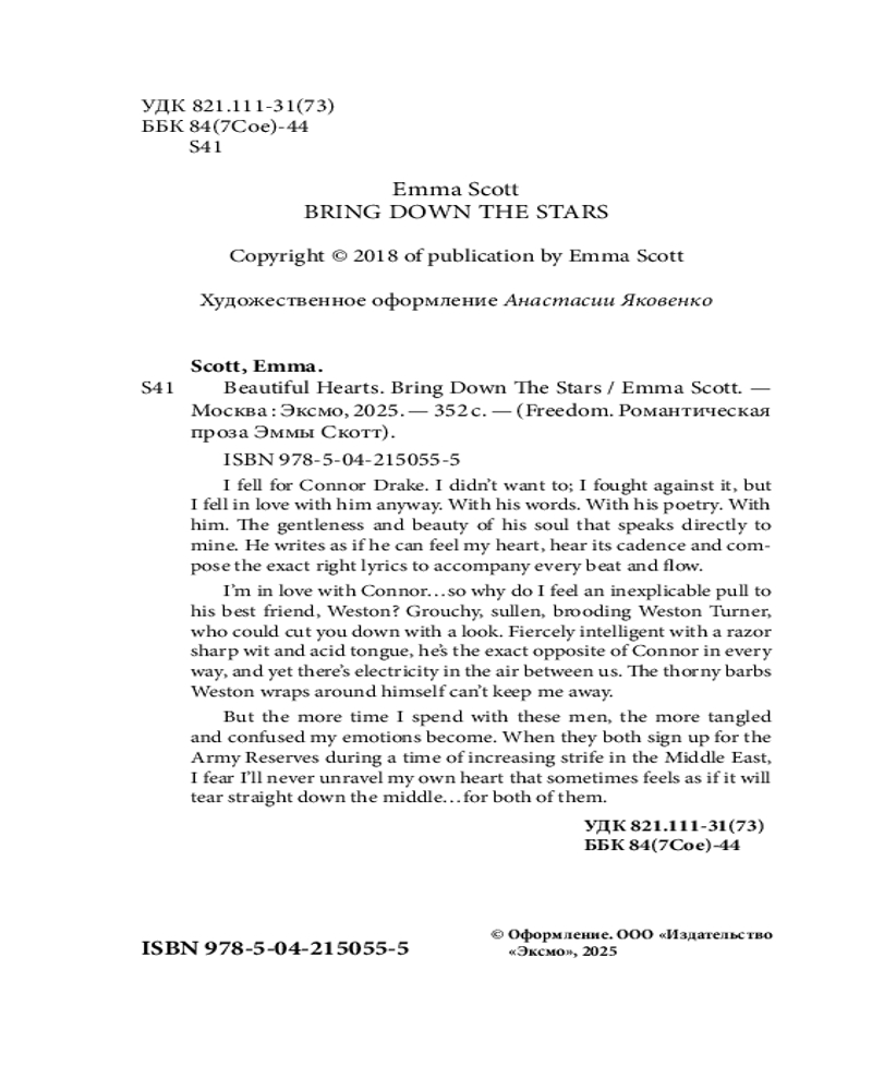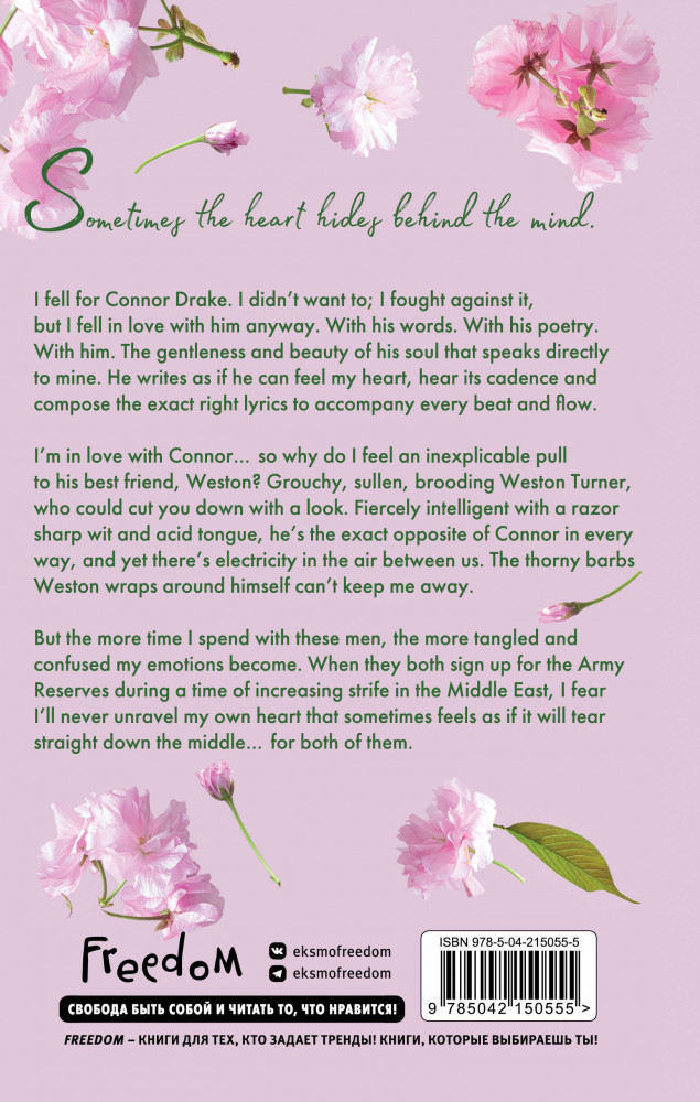 💳 Оплатить за товар можно при получении 🇰🇿 Есть бесплатная доставка по Казахстану от 1 дня 🎁 Копите бонусы с каждой покупки Серия: Freedom. Романтическая проза Эммы Скотт Уэстон — парень из бедной семьи. Отец бросил их с матерью, когда Уэстон был совсем маленьким. Семейная трагедия навсегда изменила его, а еще сделала выдающимся бегуном и поэтом. Коннор — сын сенатора. С детства у него было все, о чем он только мог мечтать, кроме одобрения родителей, которые не поддерживали сына и прочили ему лишь политическую карьеру. Мальчики подружились, встретившись в элитной школе, куда Уэстон поступил благодаря своему поэтическому таланту. Друг для друга она стали опорой и защитой в непростые времена. Но все изменилось, когда годы спустя, учась в одном университете, они встретились с Отем. Рыжеволосая девушка с разбитым сердцем покорила обоих парней. Знакомство с ней стало первым испытанием для их многолетней дружбы. Книга о настоящих чувствах и их способности стать путеводной звездой. Испытайте сильные эмоции и проведите выходные в компании романтической художественной литературы! Лучший выбор для любителей книг романтики. |