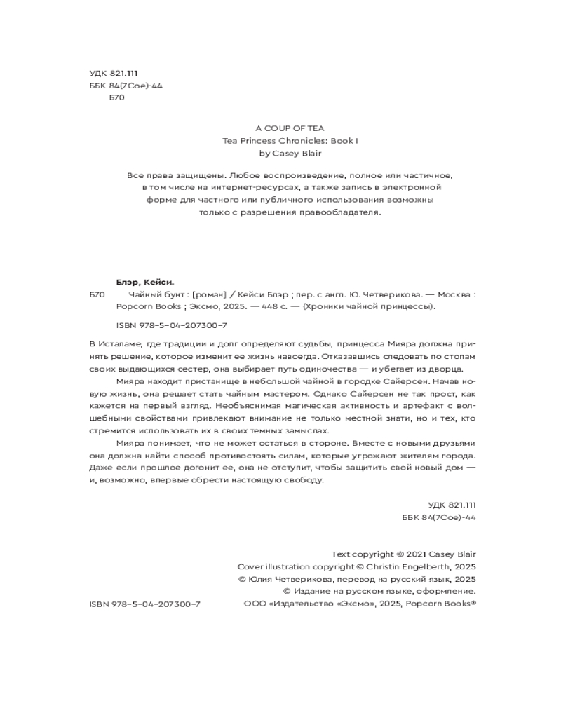 💳 Оплатить за товар можно при получении 🇰🇿 Есть бесплатная доставка по Казахстану 🎁 Копите бонусы с каждой покупки В Исталаме, где традиции и долг определяют судьбы, принцесса Мияра должна принять решение, которое изменит ее жизнь навсегда. Отказавшись следовать по стопам своих выдающихся сестер, она выбирает путь одиночества — и убегает из дворца. Мияра находит пристанище в небольшой чайной в городке Сайерсен. Начав новую жизнь, она решает стать чайным мастером. Однако Сайерсен не так прост, как кажется на первый взгляд. Необъяснимая магическая активность и артефакт с волшебными свойствами привлекают внимание не только местной знати, но и тех, кто стремится использовать их в своих темных замыслах. Мияра понимает, что не может остаться в стороне. Вместе с новыми друзьями она должна найти способ противостоять силам, которые угрожают жителям города. Даже если прошлое догонит ее, она не отступит, чтобы защитить свой новый дом — и, возможно, впервые обрести настоящую свободу. |
