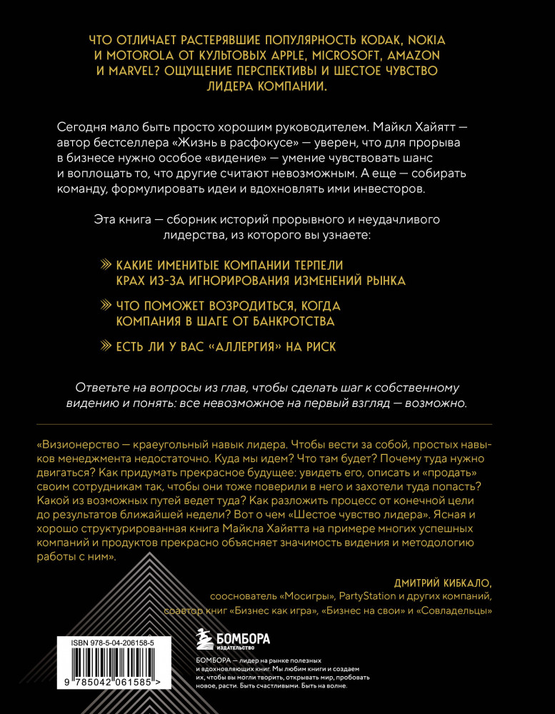💳 Оплатить за товар можно при получении 🇰🇿 Есть бесплатная доставка по Казахстану от 1 дня 🎁 Копите бонусы с каждой покупки Серия: Top expert. Практичные книги для работы над собой Что отличает растерявшие популярность Kodak, Nokia и Motorola от культовых Apple, Microsoft, Amazon и Marvel? Чувство перспективы лидера компании. Сегодня мало быть просто хорошим руководителем. Майкл Хайятт — автор бестселлера «Жизнь в расфокусе» — уверен, что для прорыва в бизнесе нужно особое «видение» — умение чувствовать шанс и воплощать то, что другие считают невозможным. А еще — собирать команду, формулировать идеи и вдохновлять ими инвесторов. Ответьте на вопросы из глав, чтобы сделать шаг к собственному видению и понять: все невозможное на первый взгляд — возможно. |