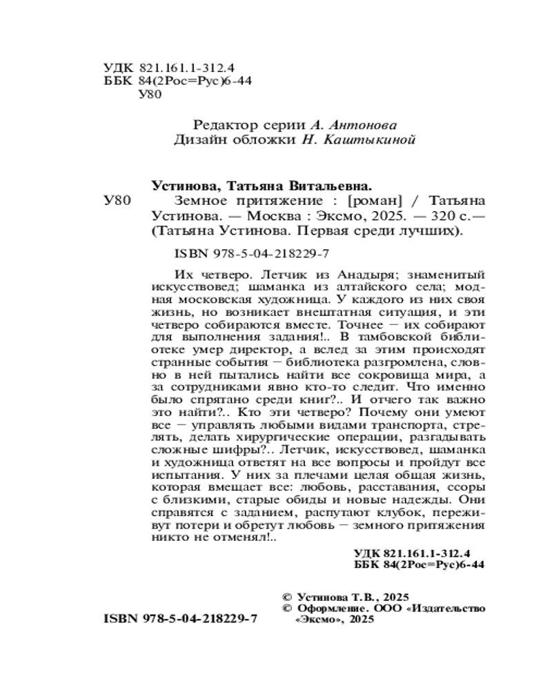 Серия: Татьяна Устинова. Первая среди лучших (обложка) Их четверо. Летчик из Анадыря; знаменитый искусствовед; шаманка из Алтайского села; модная московская художница. У каждого из них своя жизнь, но возникает внештатная ситуация, и эти четверо собираются вместе. Точнее — их собирают для выполнения задания!.. В Тамбовской библиотеке умер директор, а вслед за этим происходят странные события — библиотека разгромлена, словно в ней пытались найти все сокровища мира, а за сотрудниками явно кто-то следит. Что именно было спрятано среди книг?.. И отчего так важно это найти?..   |