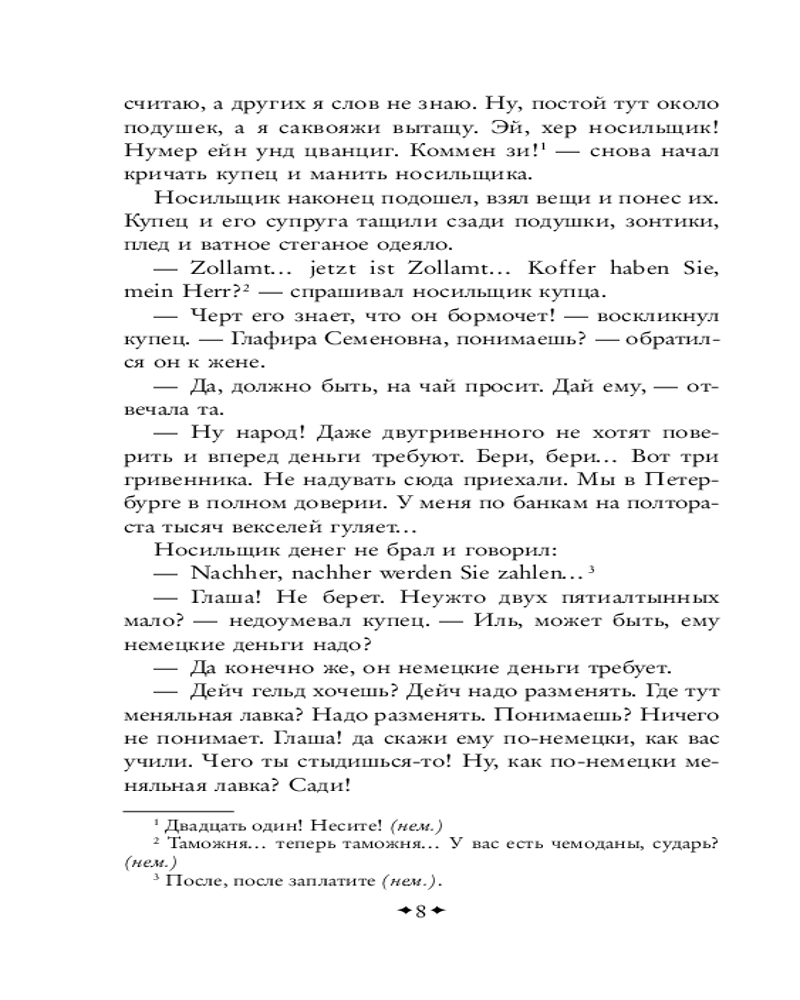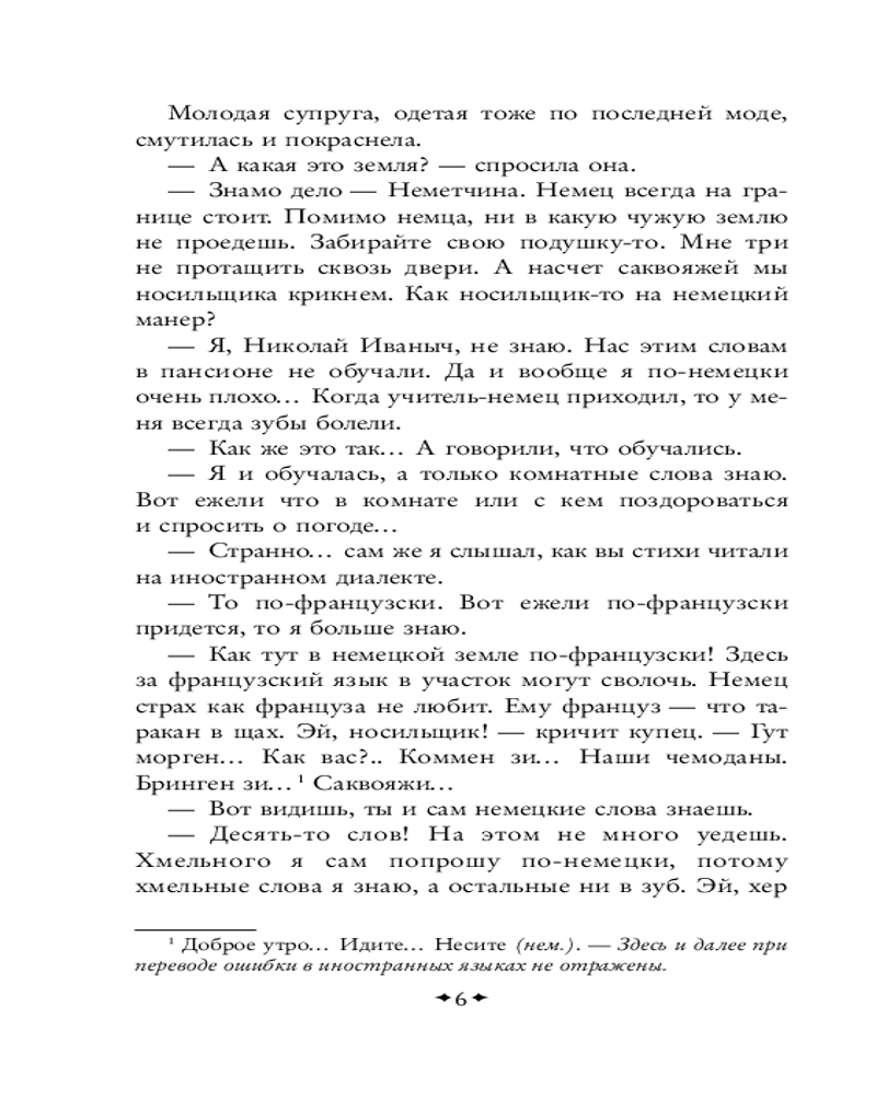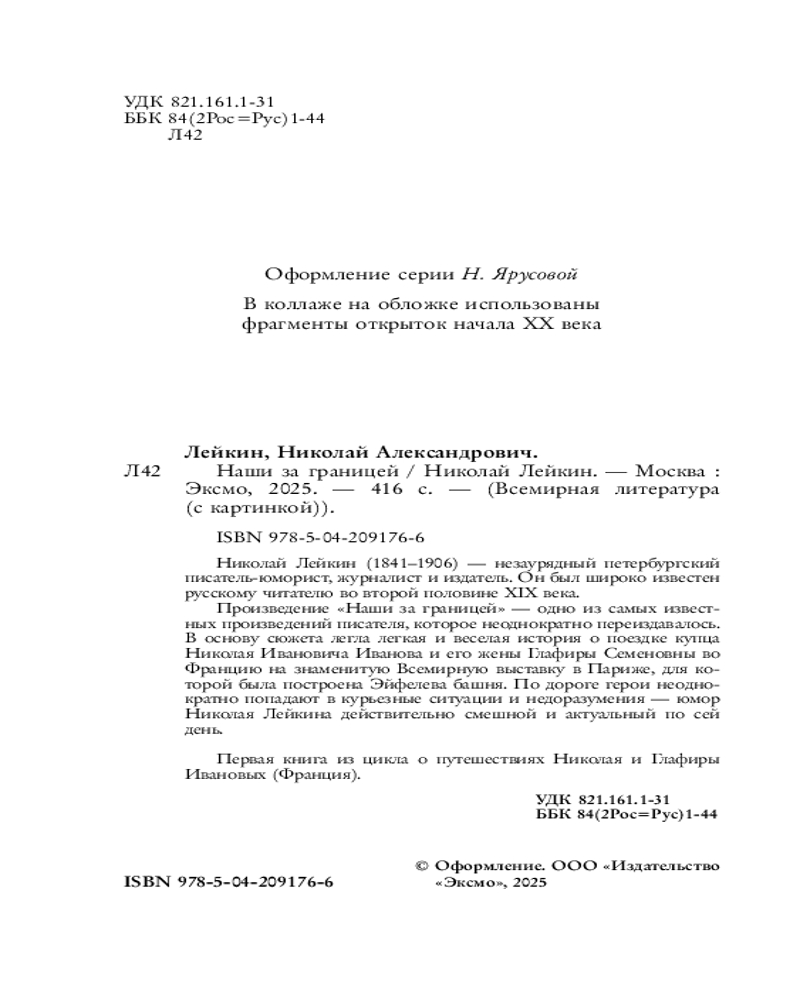 Серия: Всемирная литература (новое оформление) Николай Лейкин (1841–1906) — незаурядный петербургский писатель-юморист, журналист и издатель. Он был широко известен русскому читателю во второй половине XIX века. Произведение «Наши за границей» — одно из самых известных произведений писателя, которое неоднократно переиздавалось. В основу сюжета легла легкая и веселая история о поездке купца Николая Ивановича Иванова и его жены Глафиры Семеновны во Францию на знаменитую Всемирную выставку в Париже, для которой была построена Эйфелева башня. По дороге герои неоднократно попадают в курьезные ситуации и недоразумения — юмор Николая Лейкина действительно смешной и актуальный по сей день. Первая книга из цикла о путешествиях Николая и Глафиры Ивановых (Франция). С заботой о глазах! Издание с крупным шрифтом для удобства чтения. |