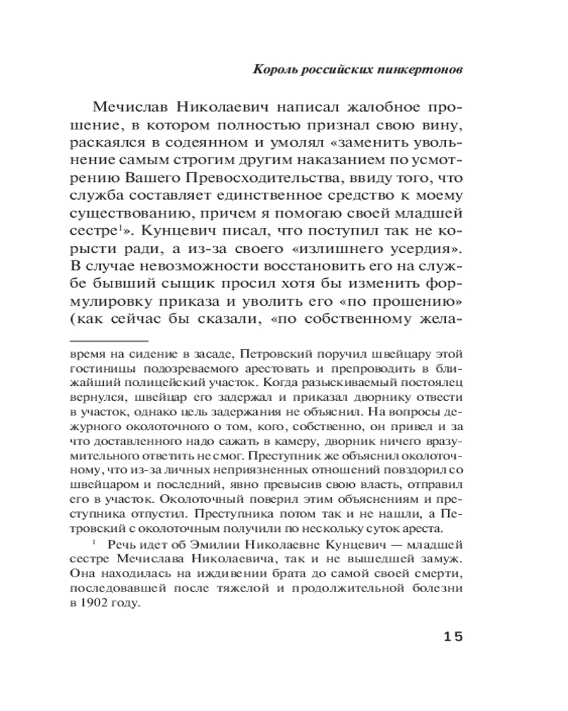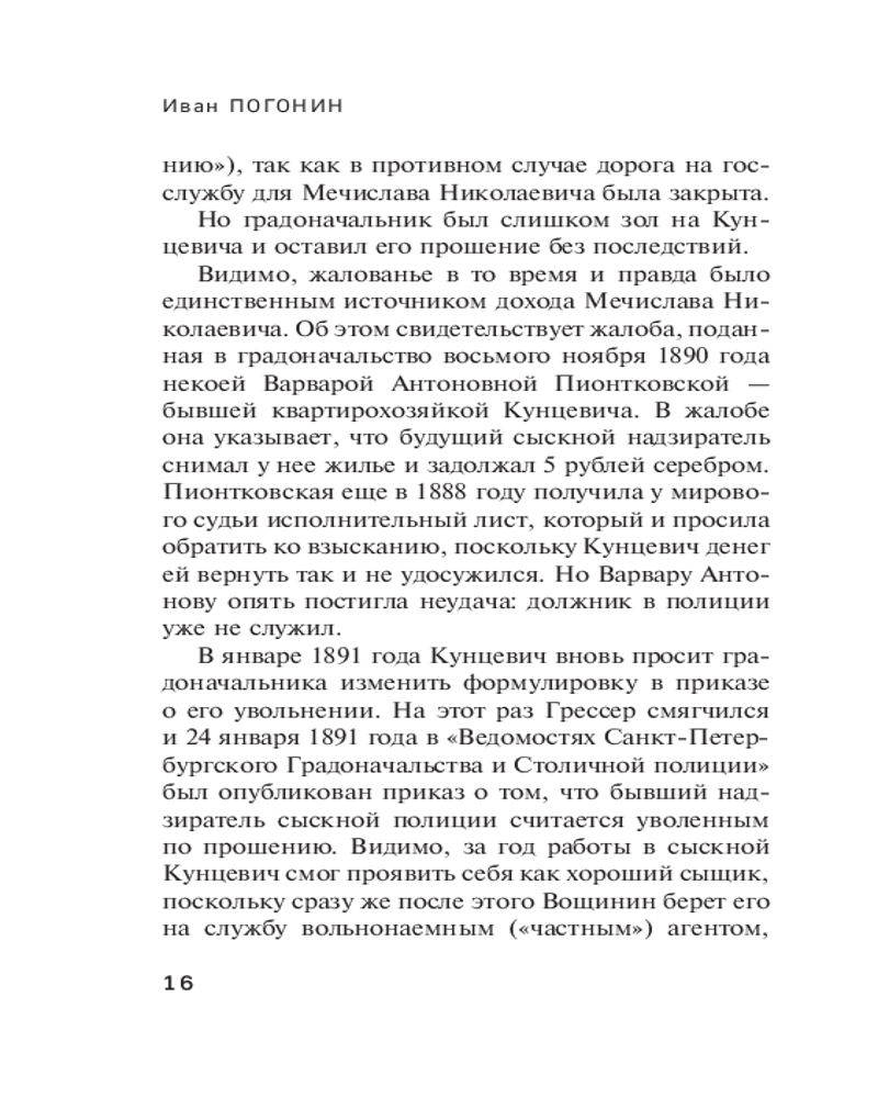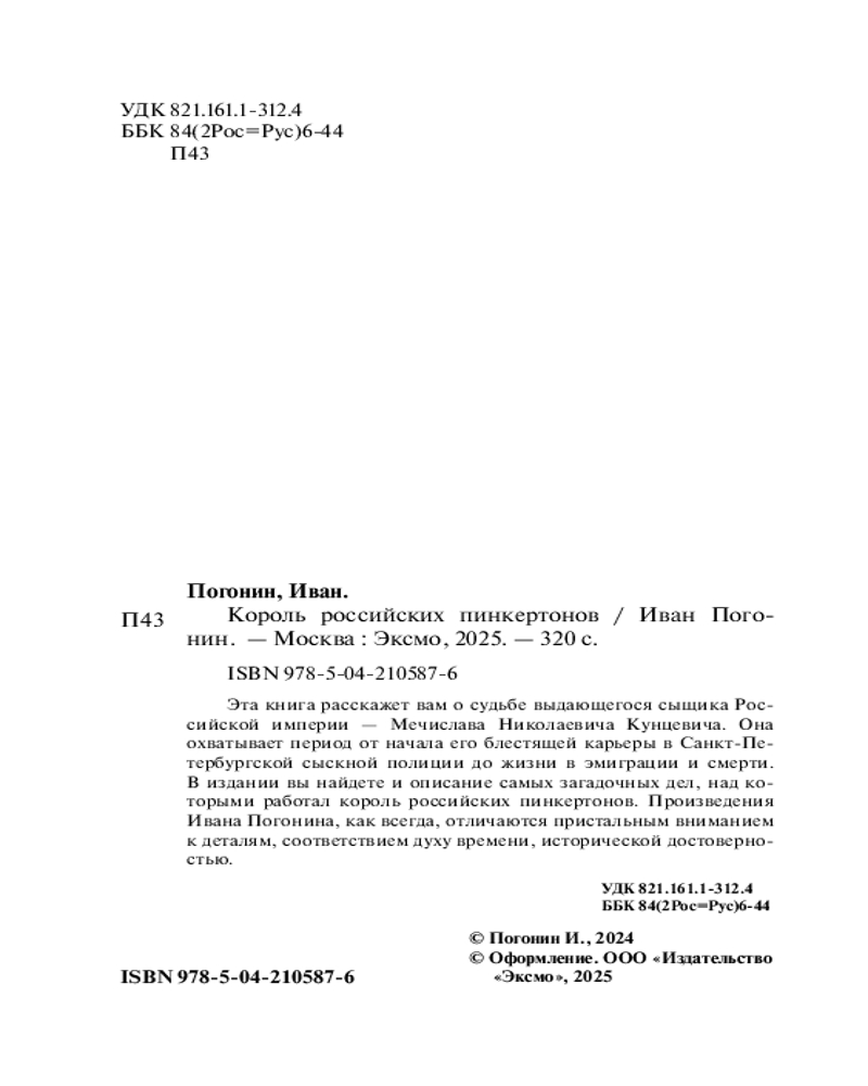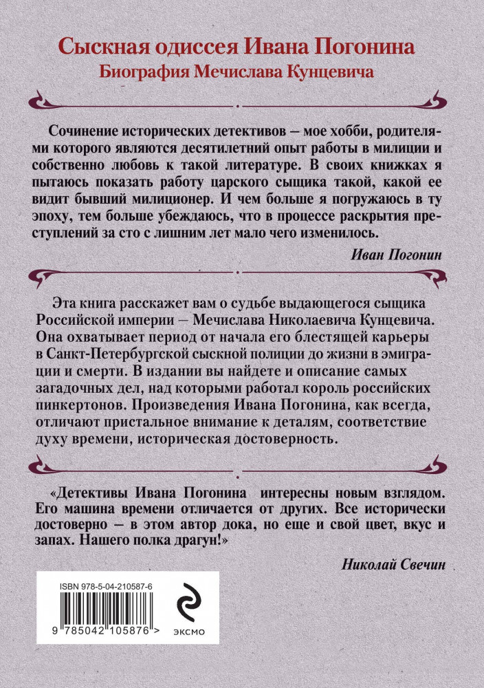 Король российских пинкертоновВ данный момент этот товар отсутствует в продаже. Возможно, у нас найдется аналогичный или похожий товар здесь. Серия: Сыскная одиссея. Исторические детективы Ивана Погонина Эта книга расскажет вам о судьбе выдающегося сыщика Российской империи — Мечислава Николаевича Кунцевича. Она охватывает период от начала его блестящей карьеры в Санкт-Петербургской сыскной полиции до жизни в эмиграции и смерти. В издании вы найдете и описание самых загадочных дел, над которыми работал король российских пинкертонов. Книга основана на архивных материалах и свидетельствах современников. |