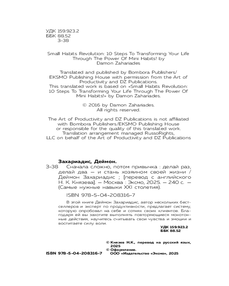 💳 Оплатить за товар можно при получении 🇰🇿 Есть бесплатная доставка по Казахстану от 1 дня 🎁 Копите бонусы с каждой покупки Серия: Самые нужные навыки 21 столетия В этой книге Деймон Захариадис, автор нескольких бестселлеров и эксперт по продуктивности, предлагает систему, которую опробовал на себе и сотнях своих клиентов. Благодаря ей, вы захотите выполнять повторяющиеся монотонные действия, научитесь считывать свои чувства и эмоции и воспитаете силу воли. |