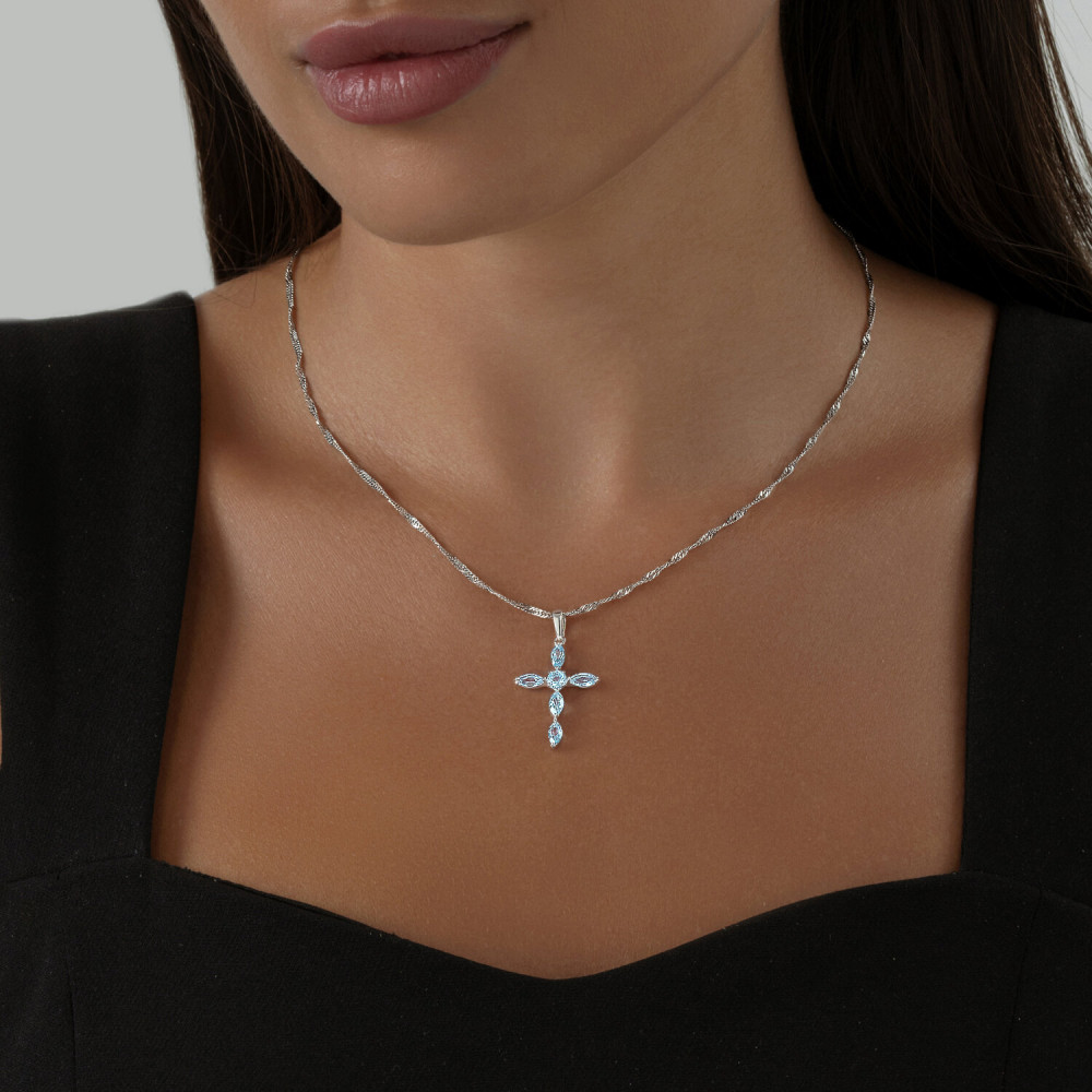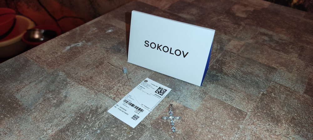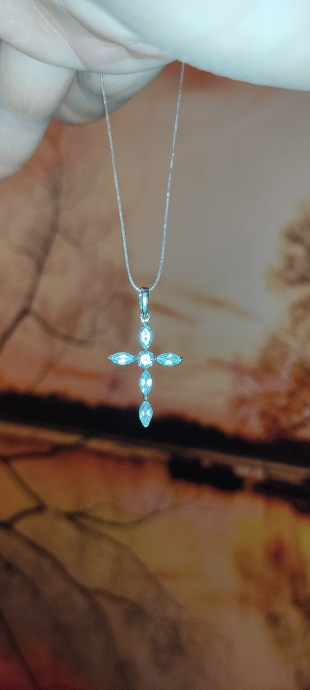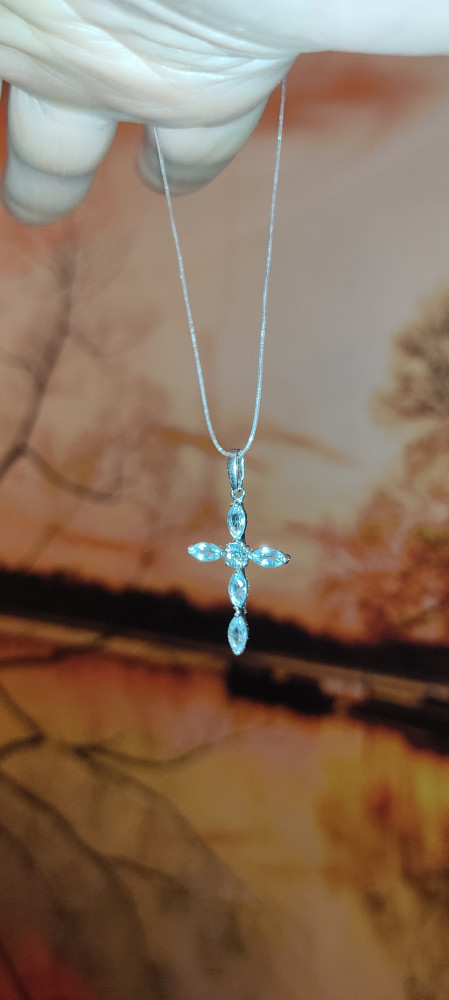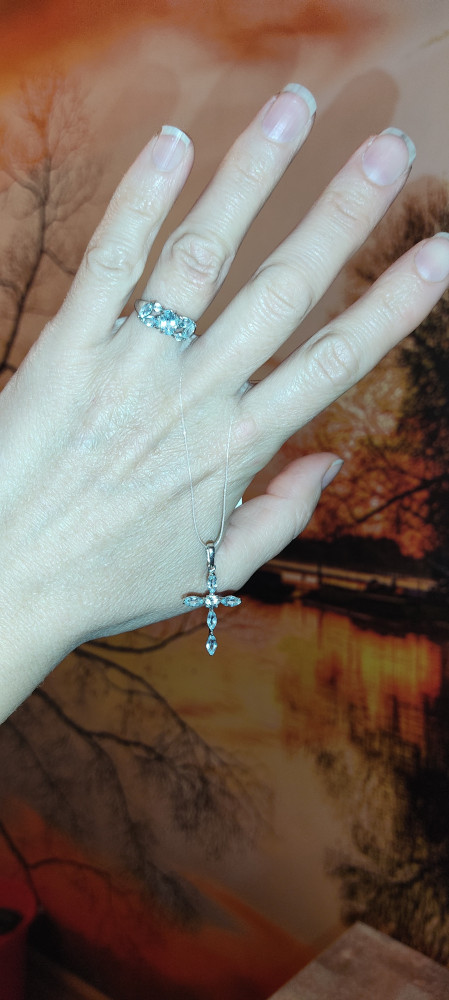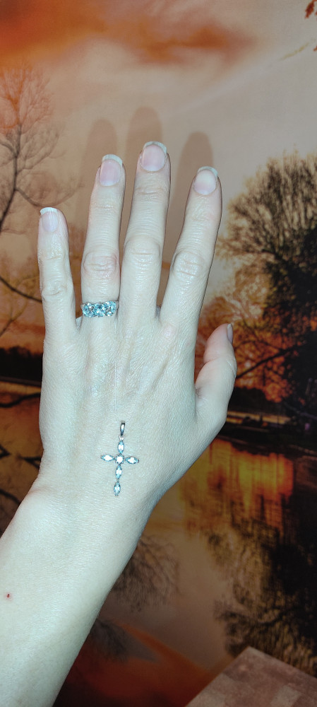 Дочка подарила мне кольцо с топазом и я увидела к нему в компанию крестик. Очень нежный, камни не перекрыты. Цвет светло светло голубой, светлее чем на картинке или фото, почти белый. Цвет камня Sky, это значит натуральный природный цвет без облучения. Пломба, проба, коробочка оригинальная треугольная для подарка. Доставка день в день. Спасибо Флипп!