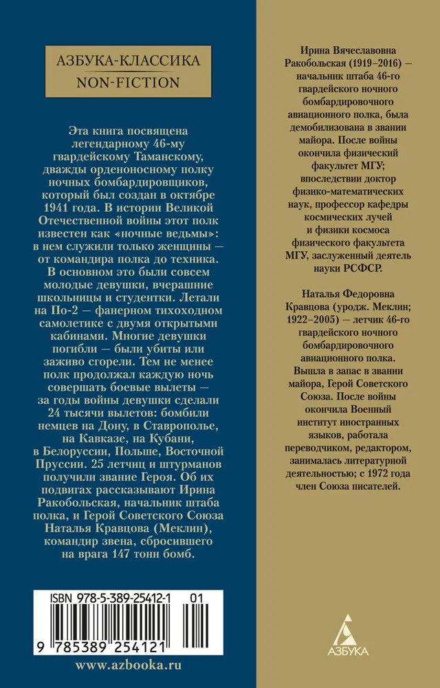 💳 Оплатить за товар можно при получении 🇰🇿 Есть бесплатная доставка по Казахстану от 1 дня 🎁 Копите бонусы с каждой покупки Серия: Азбука-Классика. Non-Fiction Эта книга посвящена легендарному 46-му гвардейскому Таманскому, дважды орденоносному полку ночных бомбардировщиков, который был создан в октябре 1941 года. В истории Великой Отечественной войны этот полк известен как «ночные ведьмы»: в нем служили только женщины — от командира полка до техника. В основном это были совсем молодые девушки, вчерашние школьницы и студентки. За годы войны девушки сделали 24 тысячи боевых вылетов: бомбили немцев на Дону, в Ставрополье, на Кавказе, на Кубани, в Белоруссии, Польше, Восточной Пруссии. 25 летчиц и штурманов получили звание Героя. Об их подвигах рассказывают Ирина Ракобольская, начальник штаба полка, и Герой Советского Союза Наталья Кравцова (Меклин), командир звена, сбросившего на врага 147 тонн бомб. |