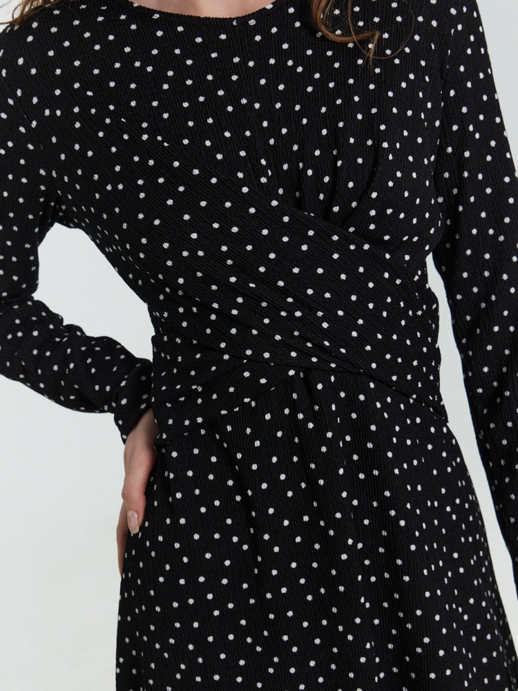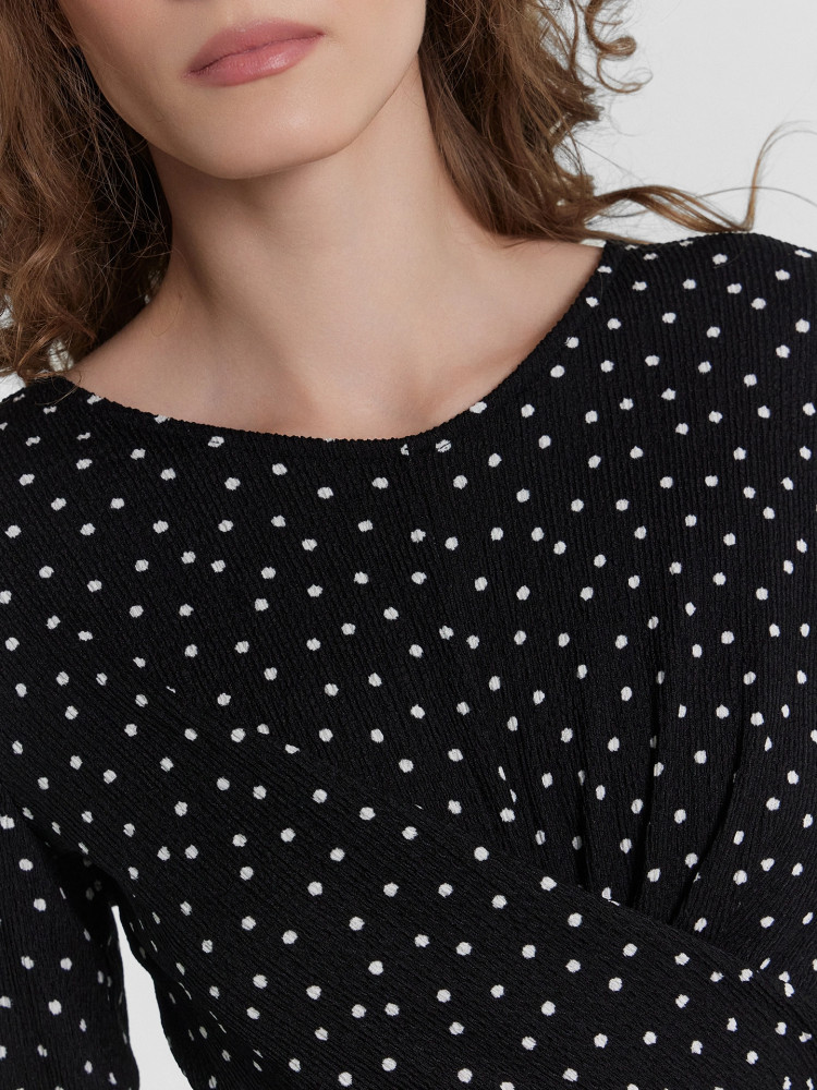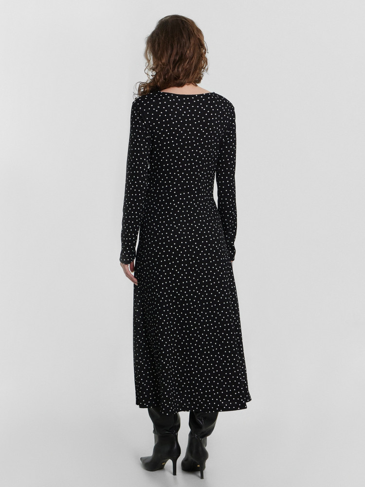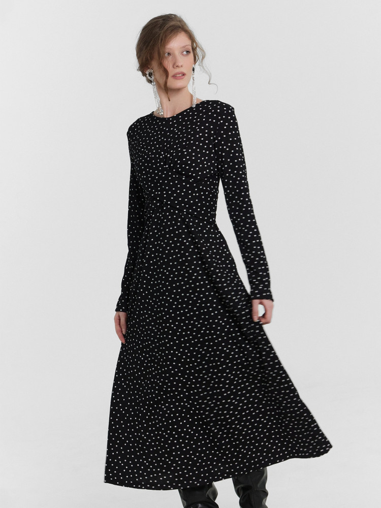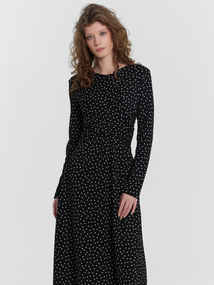Очаровательное платье прилегающего силуэта длиной миди станет прекрасным дополнением вашего гардероба. Его круглая горловина и длинные рукава придают классический и элегантный вид, который подчеркнет вашу утонченность и стиль. Модель выполнена из нежного и приятного на ощупь материала, который обеспечивает комфорт на протяжении всего дня.