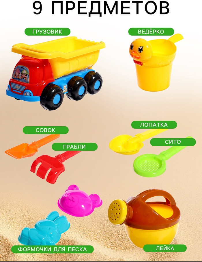Набор для игры в песке «Грузовичок»В данный момент этот товар отсутствует в продаже. Возможно, у нас найдется аналогичный или похожий товар здесь. Подарите вашему малышу радость беззаботной игры на свежем воздухе с ярким и увлекательным набором игрушек для песочницы! Игрушки изготовлены из прочного и безопасного пластика, не имеют острых краёв и идеально подходят для маленьких ручек. Насыщенные цвета, забавные формы и лёгкость в использовании сделают этот набор любимым спутником вашего ребёнка на прогулках. Идеально подходит для игры в песочнице, на пляже или в саду. Развивайте воображение, моторику и творческие способности вашего малыша с нашим универсальным игровым набором! |