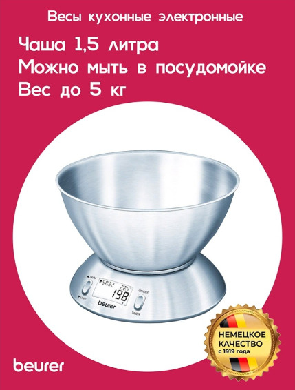Beurer Весы кухонные KS 54В данный момент этот товар отсутствует в продаже. Возможно, у нас найдется аналогичный или похожий товар здесь. Имеют функции таймера и комнатного термометра. В комплект поставки KS54 входит съемная чаша из нержавеющей стали (объем 1,5 л). |