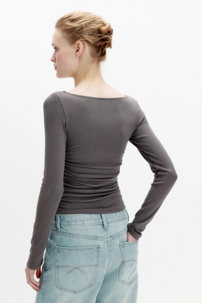 Женский лонгслив приталенного кроя из тонкой, мягкой и очень приятной к телу вискозной ткани с гладкой трикотажной фактурой. Широкий вырез-лодочка горловины без воротника. Длинные облегающие рукава с прямыми манжетами и прямой линией плеча. Декоративные драпировки по бокам.