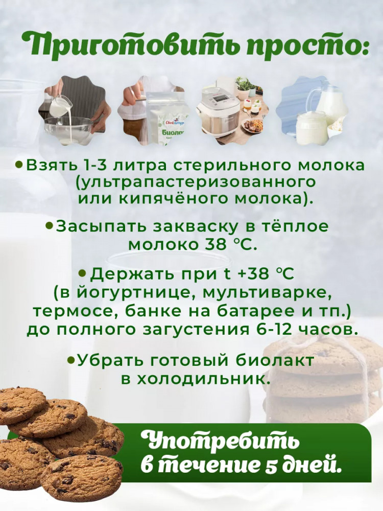 Закваска для биолакта «Свой йогурт» это — здоровье и экономия, Вы получите до 30 литров домашнего биолакта! Домашние продукты на заквасках — это отличный завтрак и перекус для всей семьи. Готовить его легко, в этом поможет подробная инструкция на упаковке. 1 стик может заквасить до 3 литров ультрапастеризованного молока. Именно его нужно использовать! Если вы готовите на домашнем молоке, его нужно прокипятить, чтоб в молоке не было посторонней микрофлоры. Выбирайте полезное питание, стройную фигуру и здоровье для себя и ребенка. Попробовав один раз домашний биолакт, вы больше не захотите покупать его в магазине.