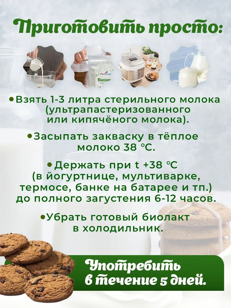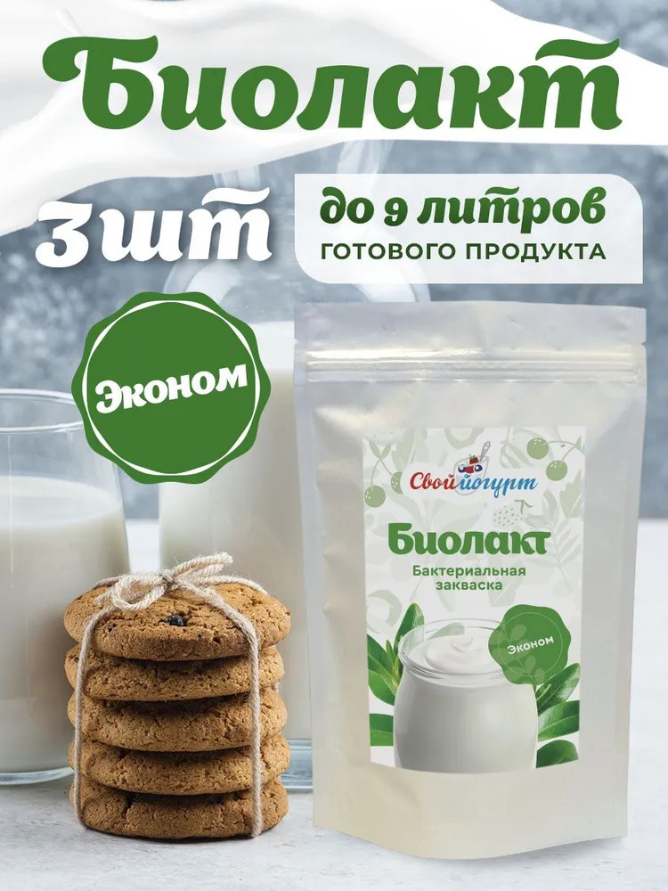Закваска для биолакта «Свой йогурт» это — здоровье и экономия, Вы получите до 9 литров домашнего биолакта! Домашние продукты на заквасках — это отличный завтрак и перекус для всей семьи. Готовить его легко, в этом поможет подробная инструкция на упаковке. 1 стик может заквасить до 3 литров ультрапастеризованного молока. Именно его нужно использовать! Если вы готовите на домашнем молоке, его нужно прокипятить, чтоб в молоке не было посторонней микрофлоры. Выбирайте полезное питание, стройную фигуру и здоровье для себя и ребенка. Попробовав один раз домашний биолакт, вы больше не захотите покупать его в магазине.