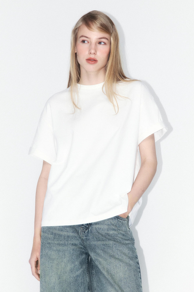 Женская футболка свободного кроя (loose fit) выполнена из дышащей 100% хлопковой ткани высокой плотности с гладкой, приятной на ощупь фактурой. Классический круглый вырез горловины без воротника подчеркивает лаконичный стиль модели. Футболка оснащена короткими рукавами выше локтя с зафиксированными отворотами и спущенной линией плеча, что придает образу расслабленность и современность. Модель представлена в разнообразных однотонных расцветках без принтов, что делает ее универсальной и подходящей для любого настроения и повода. Эта стильная и практичная футболка отлично подойдет как для занятий спортом, фитнесом и бега, так и для домашнего отдыха. Благодаря натуральной, плотной и в то же время дышащей ткани, она обеспечивает комфорт в жаркую и прохладную погоду. Легко сочетается с любым низом и идеально вписывается в повседневные образы для прогулок, отпуска, офиса, школы или просто на каждый день.