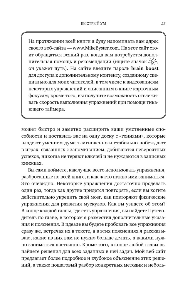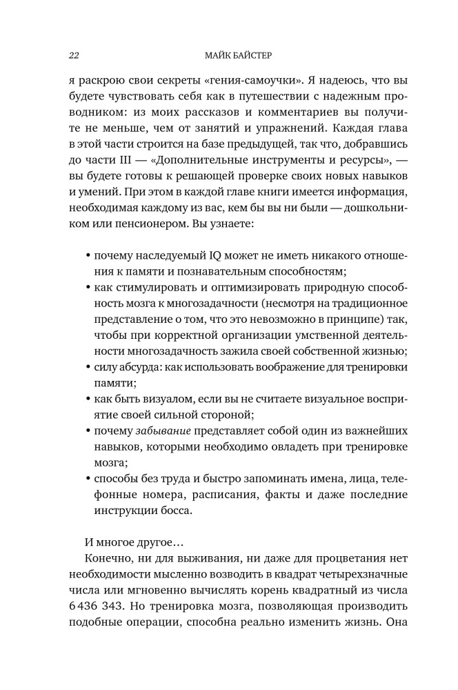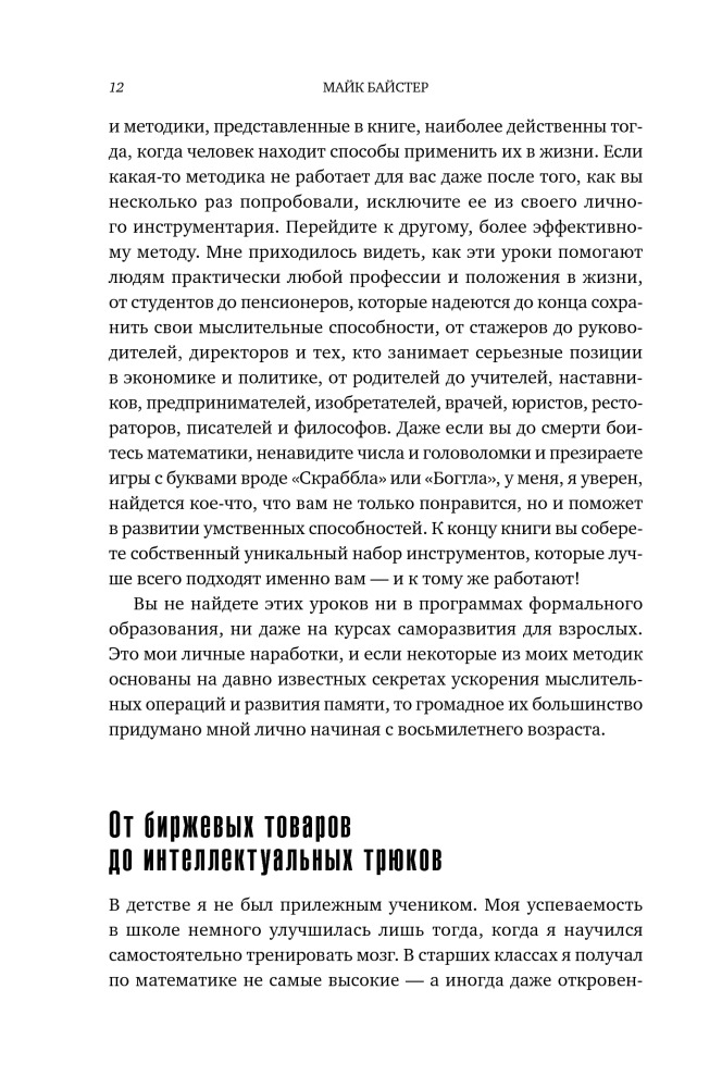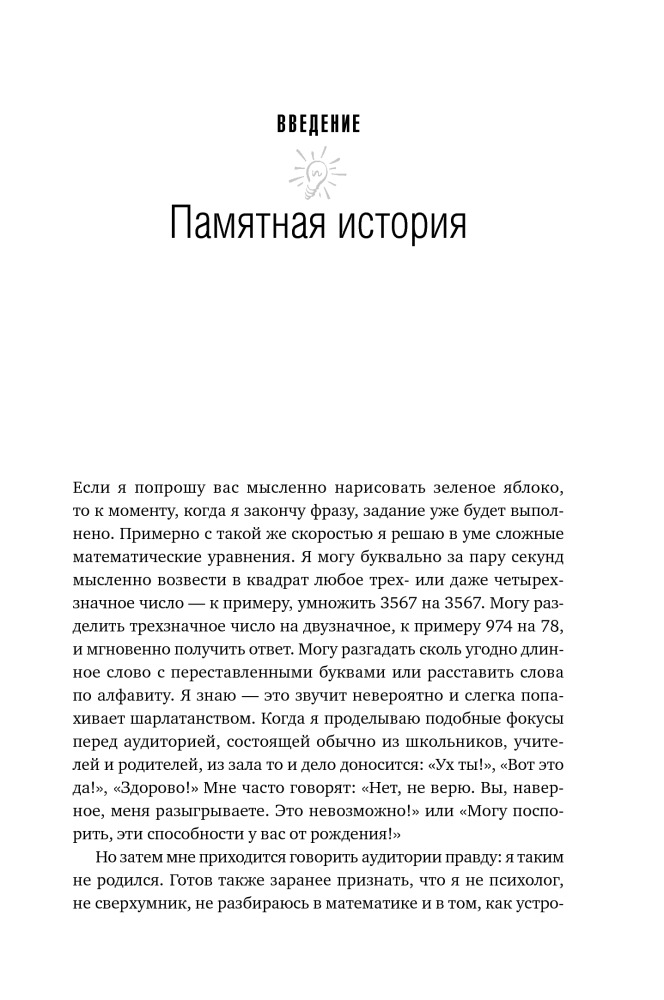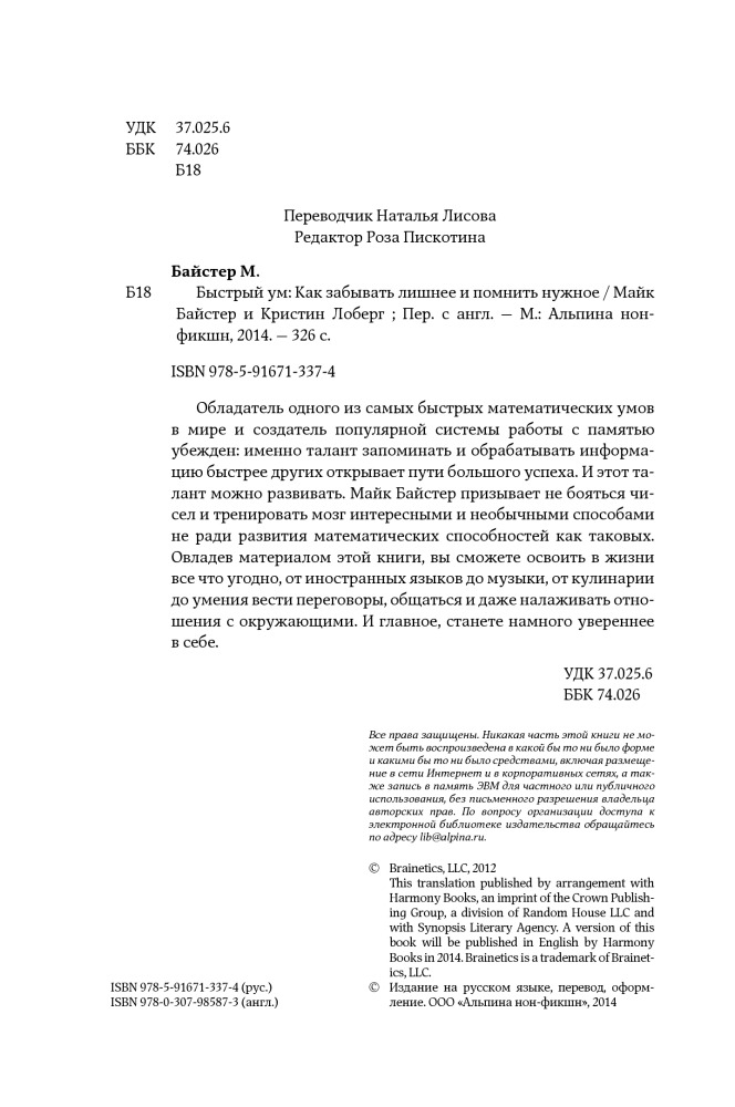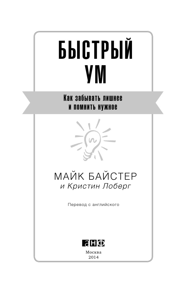 Быстрый ум. Как забывать лишнее и помнить нужноеВ данный момент этот товар отсутствует в продаже. Возможно, у нас найдется аналогичный или похожий товар здесь. Обладатель одного из самых быстрых математических умов в мире и создатель популярной системы работы с памятью убежден: именно талант запоминать и обрабатывать информацию быстрее других открывает пути большого успеха. И этот талант можно развивать. Майк Байстер призывает не бояться чисел и тренировать мозг интересными и необычными способами не ради развития математических способностей как таковых. Овладев материалом этой книги, вы сможете освоить в жизни все что угодно, от иностранных языков до музыки, от кулинарии до умения вести переговоры, общаться и даже налаживать отношения с окружающими. И главное, станете намного увереннее в себе. |