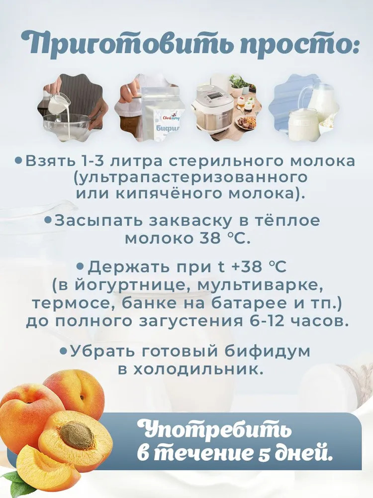 Закваска для бифидума «Свой йогурт» это — здоровье и экономия, Вы получите до 9 литров домашнего бифидума! Домашние продукты на заквасках — это отличный завтрак и перекус для всей семьи. Готовить его легко, в этом поможет подробная инструкция на упаковке. 1 стик может заквасить до 3 литров ультрапастеризованного молока. Именно его нужно использовать! Если вы готовите на домашнем молоке, его нужно прокипятить, чтоб в молоке не было посторонней микрофлоры.
