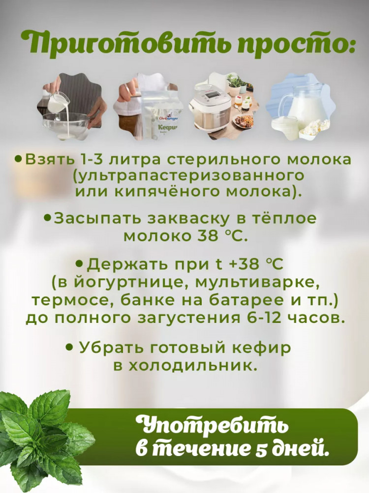 Закваска для кефира «Свой йогурт» это — здоровье и экономия, Вы получите до 30 литров домашнего кефира! Домашние продукты на заквасках — это отличный завтрак и перекус для всей семьи. Готовить его легко, в этом поможет подробная инструкция на упаковке. 1 стик может заквасить до 3 литров молока. Выбирайте полезное питание, стройную фигуру и здоровье для себя и ребенка. Попробовав один раз домашний кефир, вы больше не захотите покупать его в магазине. Всеми любимый популярный продукт сильно выигрывает по сравнению с магазинным товаром. Получается не просто вкусный кефир, а кефир, обладающий дополнительными полезными свойствами. Дефицит бифидобактерий часто сопровождается различными аллергиями и диатезом у детей, пониженным иммунитетом, а также ведет к формированию хронических расстройств пищеварения взрослого человека.